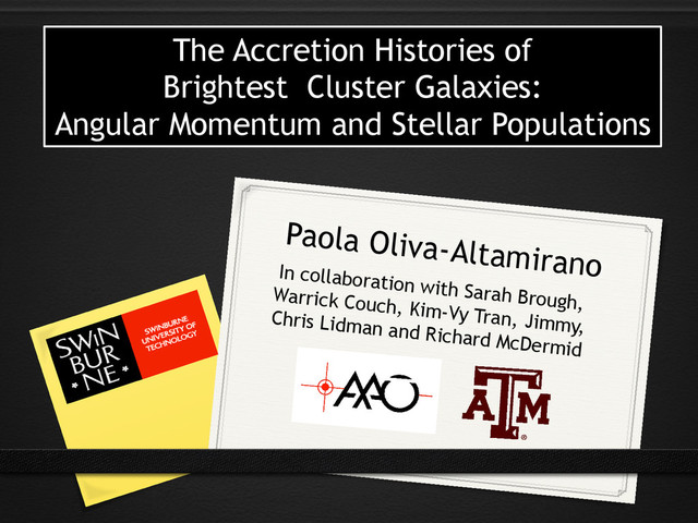 with the Angular momentum of its host clusters? • How do the stellar kinematics and stellar population profiles of BCGs change out of one effective radii? • What is the star formation history of these galaxies? When do they quench? Oliva-Altamirano 29 Hopefully some of them will be soon solved by the SAMI and MASSIVE survey!