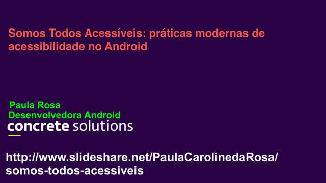 Slides da palestra de acessibilidade para aplicações android. Aqui você aprenderá como pequenas linhas de código, podem oferecer apps com acessibilidade. O maior foco é no talkback, voltado para pessoas com desabilidades visuais.