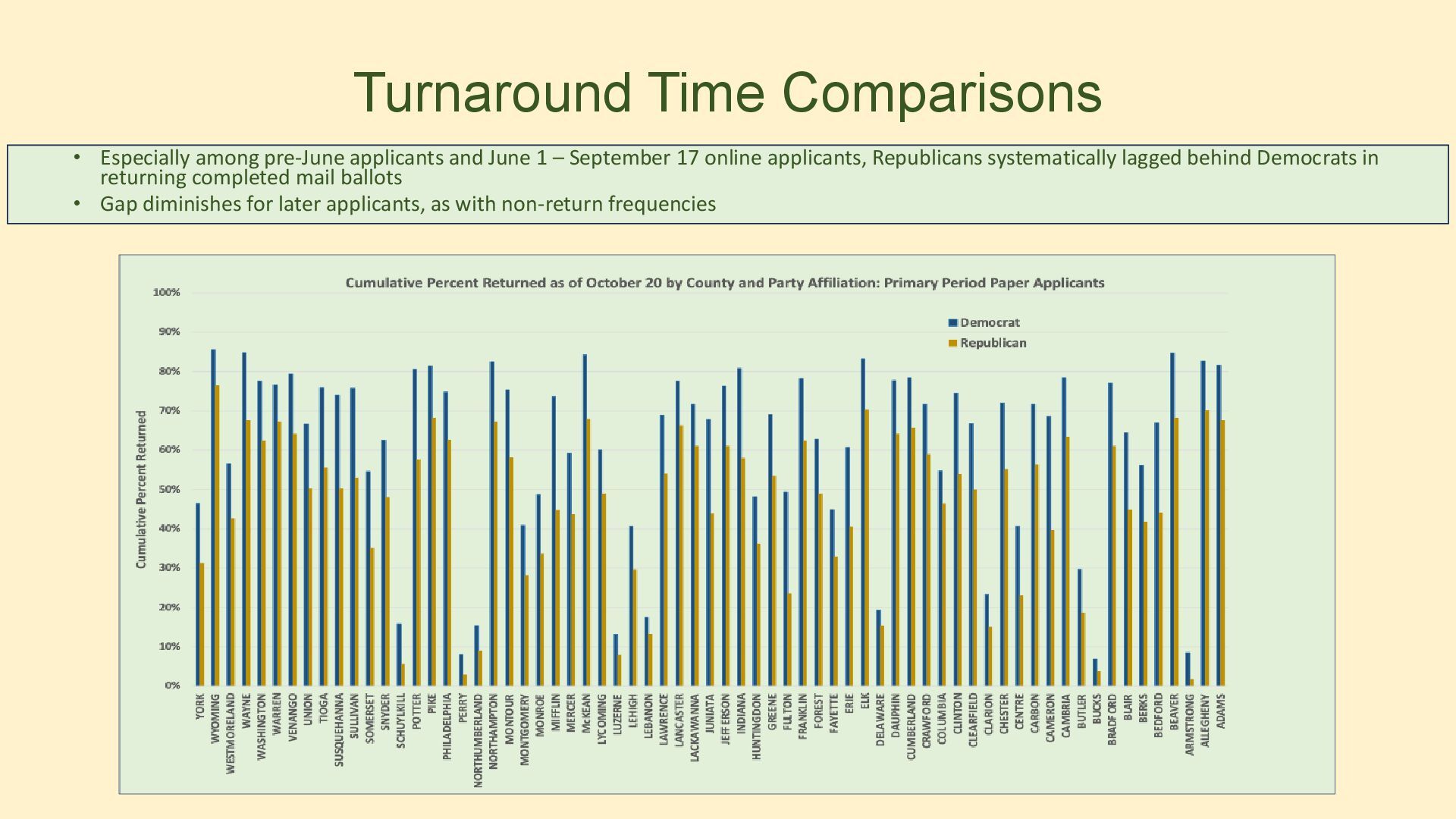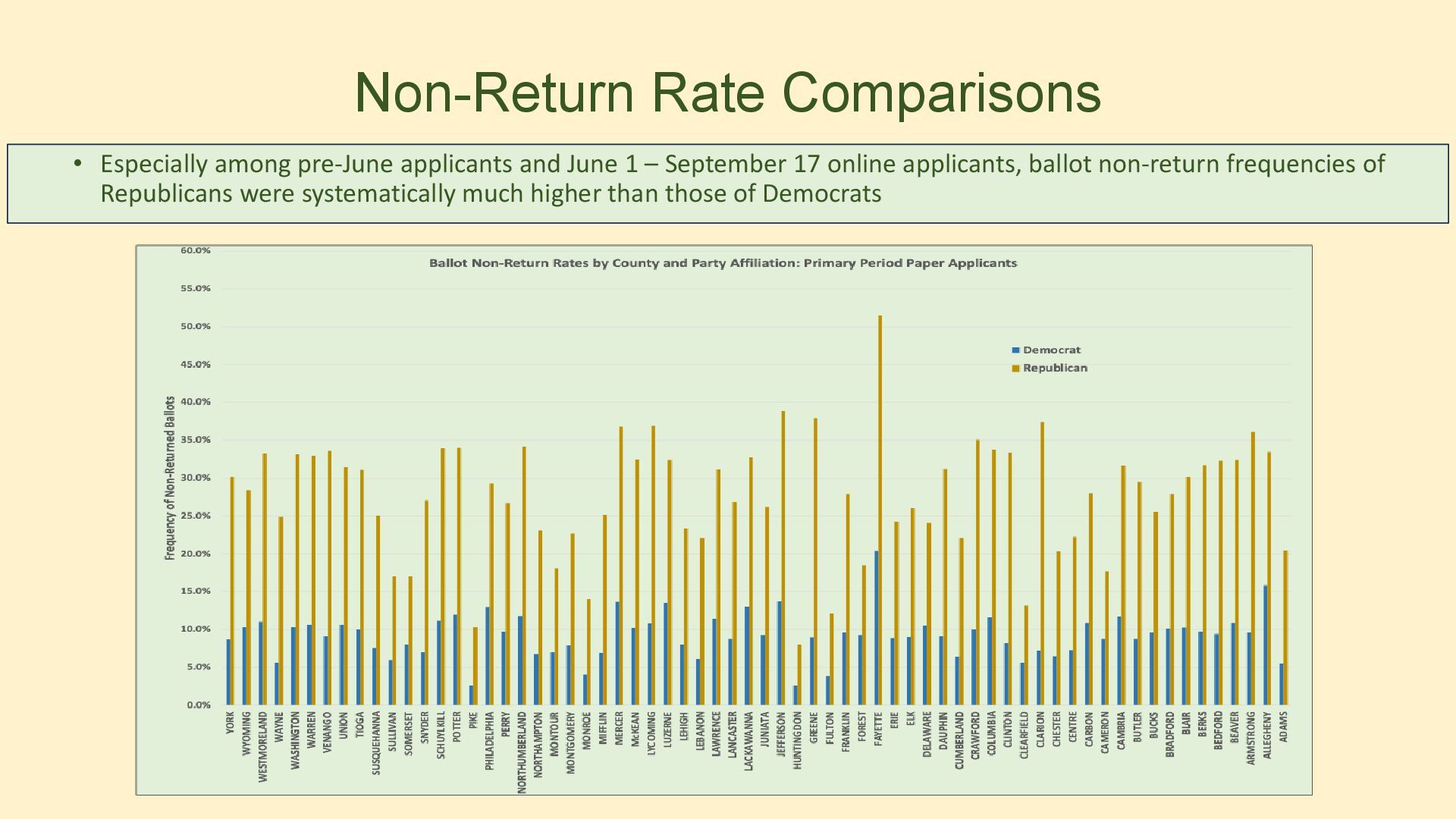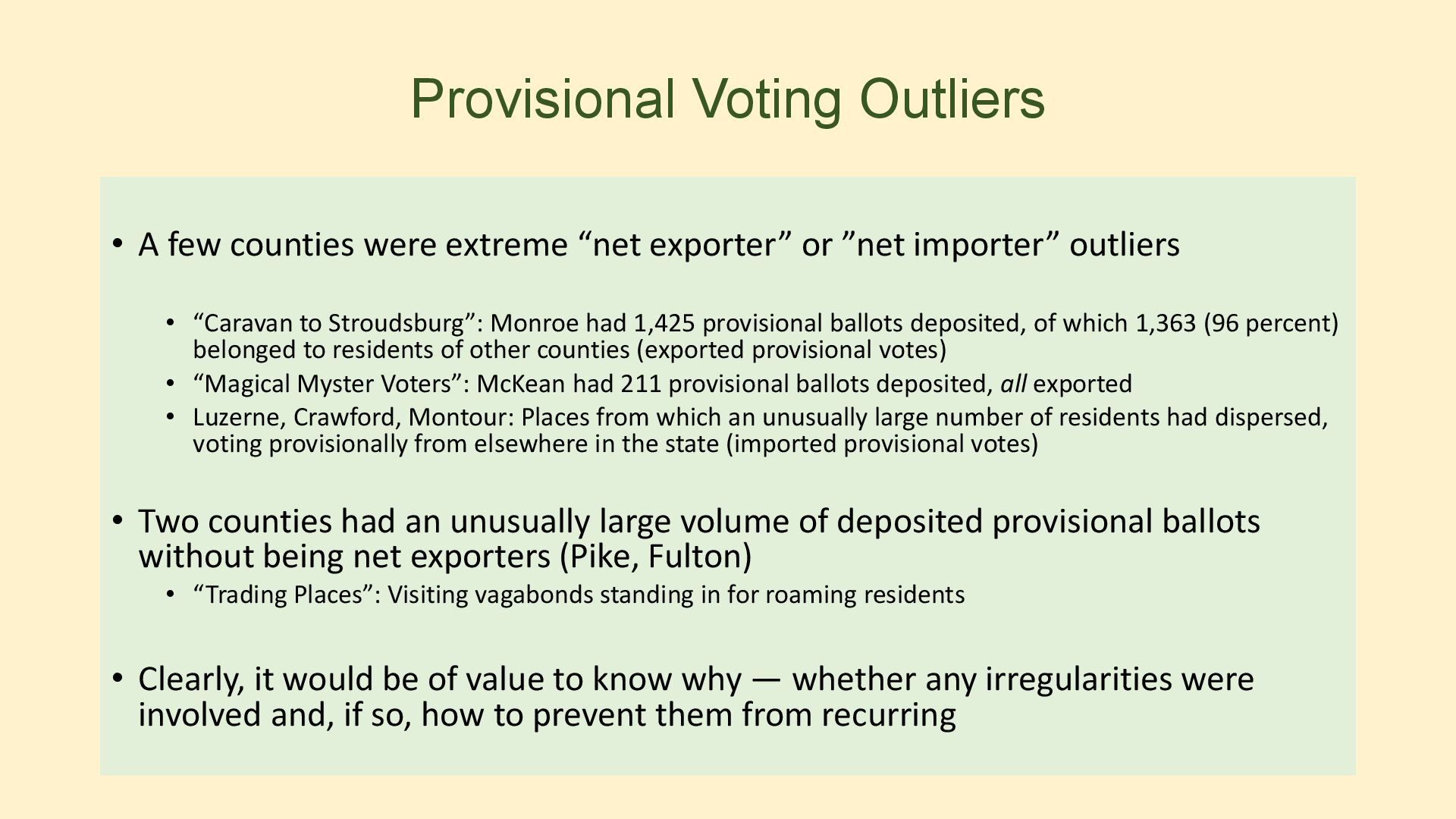 exporter” or ”net importer” outliers • “Caravan to Stroudsburg”: Monroe had 1,425 provisional ballots deposited, of which 1,363 (96 percent) belonged to residents of other counties (exported provisional votes) • “Magical Myster Voters”: McKean had 211 provisional ballots deposited, all exported • Luzerne, Crawford, Montour: Places from which an unusually large number of residents had dispersed, voting provisionally from elsewhere in the state (imported provisional votes) • Two counties had an unusually large volume of deposited provisional ballots without being net exporters (Pike, Fulton) • “Trading Places”: Visiting vagabonds standing in for roaming residents • Clearly, it would be of value to know why — whether any irregularities were involved and, if so, how to prevent them from recurring