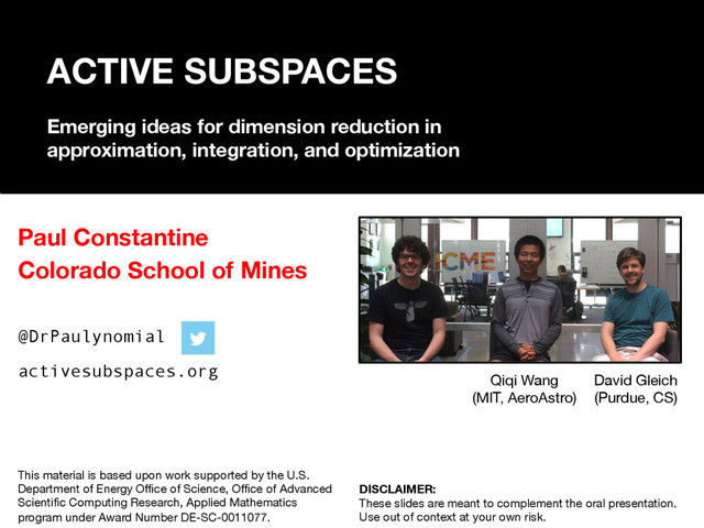 (MIT, AeroAstro) David Gleich (Purdue, CS) ACTIVE SUBSPACES Emerging ideas for dimension reduction in approximation, integration, and optimization DISCLAIMER: These slides are meant to complement the oral presentation. Use out of context at your own risk. This material is based upon work supported by the U.S. Department of Energy Office of Science, Office of Advanced Scientific Computing Research, Applied Mathematics program under Award Number DE-SC-0011077.