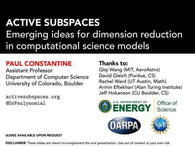 models PAUL CONSTANTINE Assistant Professor Department of Computer Science University of Colorado, Boulder activesubspaces.org! @DrPaulynomial! SLIDES AVAILABLE UPON REQUEST DISCLAIMER: These slides are meant to complement the oral presentation. Use out of context at your own risk. Thanks to: Qiqi Wang (MIT, AeroAstro) David Gleich (Purdue, CS) Rachel Ward (UT Austin, Math) Armin Eftekhari (Alan Turing Institute) Jeff Hokanson (CU Boulder, CS)