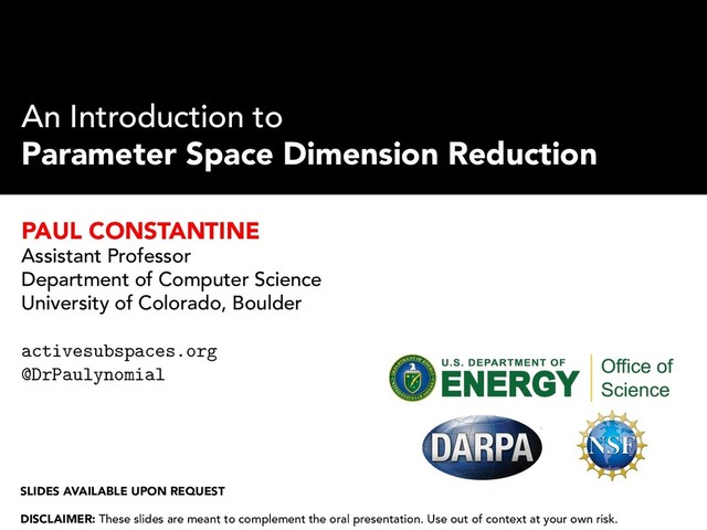 Professor Department of Computer Science University of Colorado, Boulder activesubspaces.org! @DrPaulynomial! SLIDES AVAILABLE UPON REQUEST DISCLAIMER: These slides are meant to complement the oral presentation. Use out of context at your own risk.