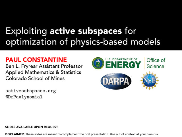 Ben L. Fryrear Assistant Professor Applied Mathematics & Statistics Colorado School of Mines activesubspaces.org! @DrPaulynomial! SLIDES AVAILABLE UPON REQUEST DISCLAIMER: These slides are meant to complement the oral presentation. Use out of context at your own risk.