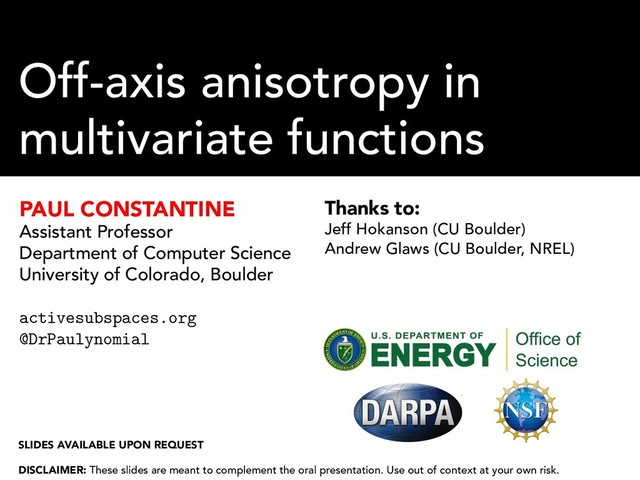 of Computer Science University of Colorado, Boulder activesubspaces.org! @DrPaulynomial! SLIDES AVAILABLE UPON REQUEST DISCLAIMER: These slides are meant to complement the oral presentation. Use out of context at your own risk. Thanks to: Jeff Hokanson (CU Boulder) Andrew Glaws (CU Boulder, NREL)