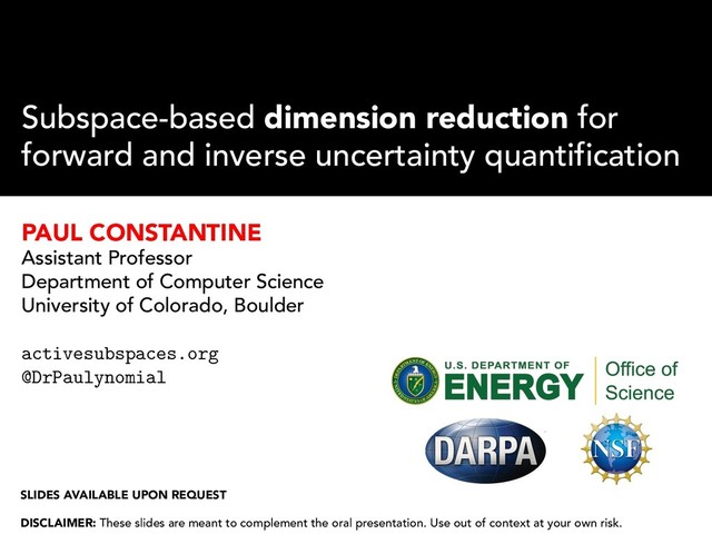 CONSTANTINE Assistant Professor Department of Computer Science University of Colorado, Boulder activesubspaces.org! @DrPaulynomial! SLIDES AVAILABLE UPON REQUEST DISCLAIMER: These slides are meant to complement the oral presentation. Use out of context at your own risk.