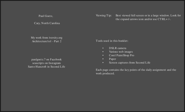 - Part 2 paulgoetz.7 on Facebook seascripts on Instagram Santo Hancroft in Second Life Viewing Tip: Best viewed full screen or in a large window. Look for the expand arrows icon and/or use CTRL+/-. Tools used in this booklet: • DSLR camera • Various web images • Corel PaintShop Pro • Paper • Screen captures from Second Life Each page contains the key points of the daily assignment and the work produced.