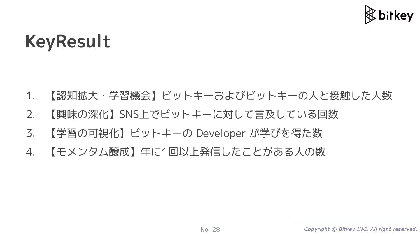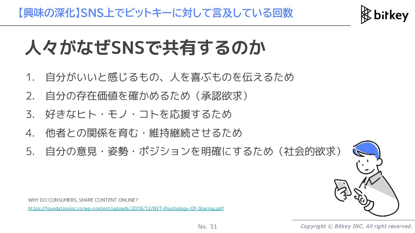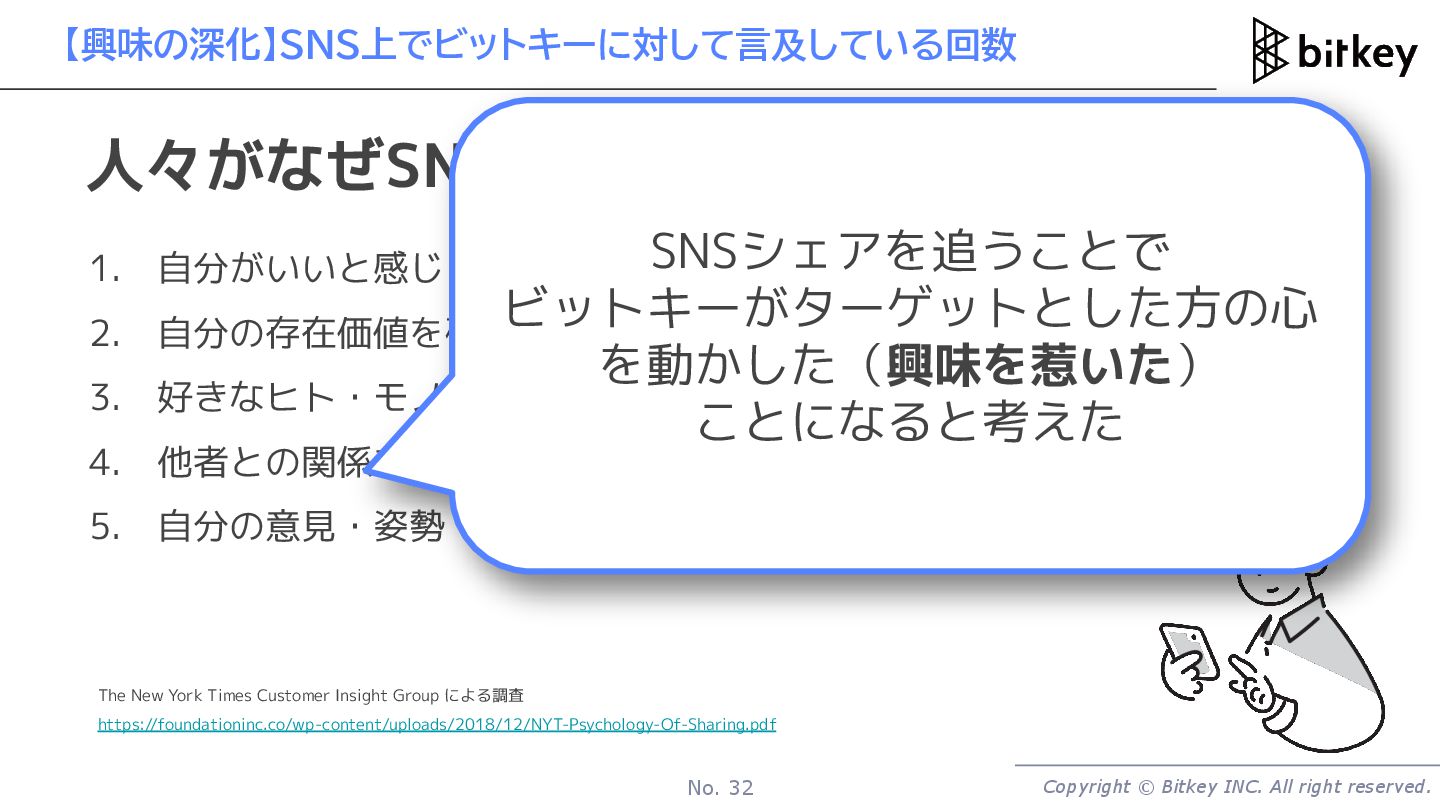 1. 自分がいいと感じるもの、人を喜ぶものを伝えるため 2. 自分の存在価値を確かめるため 3. 好きなヒト・モノ・コトを応援するため 4. 他者との関係を育む・維持継続させるため 5. 自分の意見・姿勢・ポジションを明確にするため 人々がなぜSNSで共有するのか The New York Times Customer Insight Group による調査 https://foundationinc.co/wp-content/uploads/2018/12/NYT-Psychology-Of-Sharing.pdf SNSシェアを追うことで ビットキーがターゲットとした方の心 を動かした(興味を惹いた) ことになると考えた