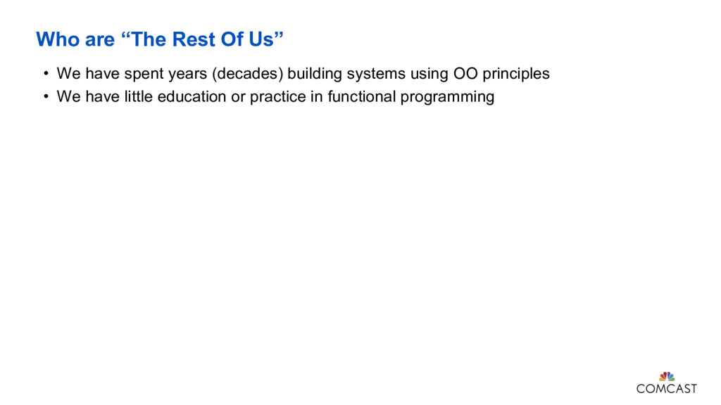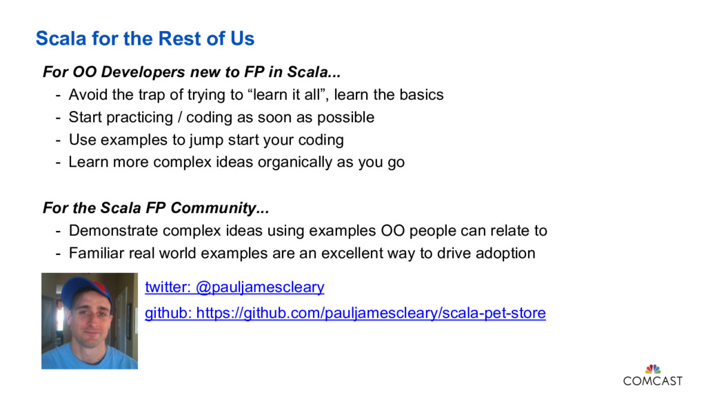 Scala can be a difficult language to get into, especially for people coming from a OO Java background. Thinking functionally doesn't come naturally to people who haven't worked in it, and a lot of the concepts and patterns are foreign and often heavily abstract. Just getting started can seem like an overwhelming effort. This talk discusses the barrier to entry in moving from OO Java to Scala and what we can do to lower that barrier. I will review the Scala Pet Store and its motivation as a means to help those new to Scala understand what a complete application looks like.