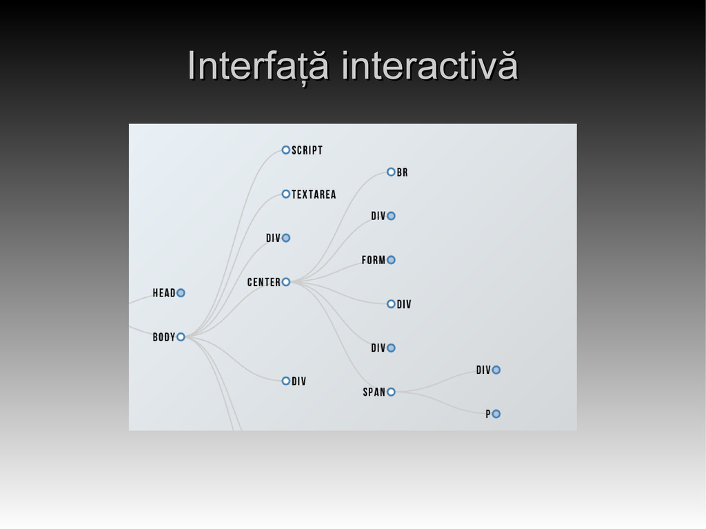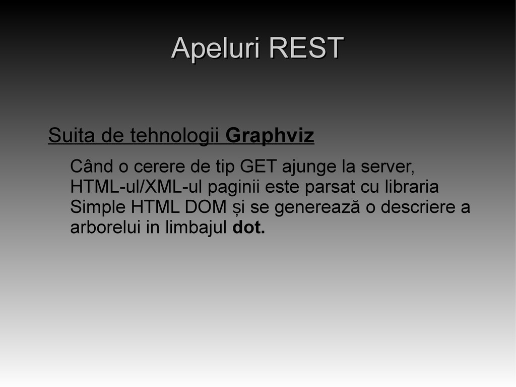 cerere de tip GET ajunge la server, HTML-ul/XML-ul paginii este parsat cu libraria Simple HTML DOM i se generează o descriere a ș arborelui in limbajul dot.