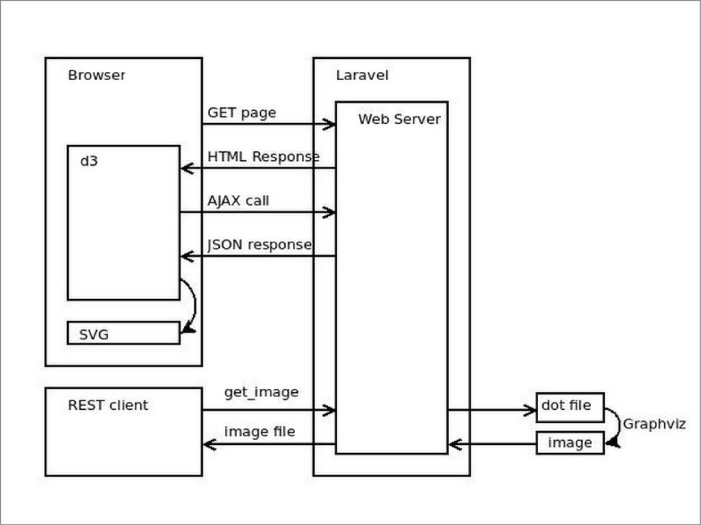 normal către /dom/{site} redirec ionează utilizatorul catre o pagină cu ț framework-ul javascript d3 care face un apel asincron către frameworkul PHP pentru o reprezentare JSON a arborelui DOM, transformându-l mai apoi într-un SVG interactiv.
