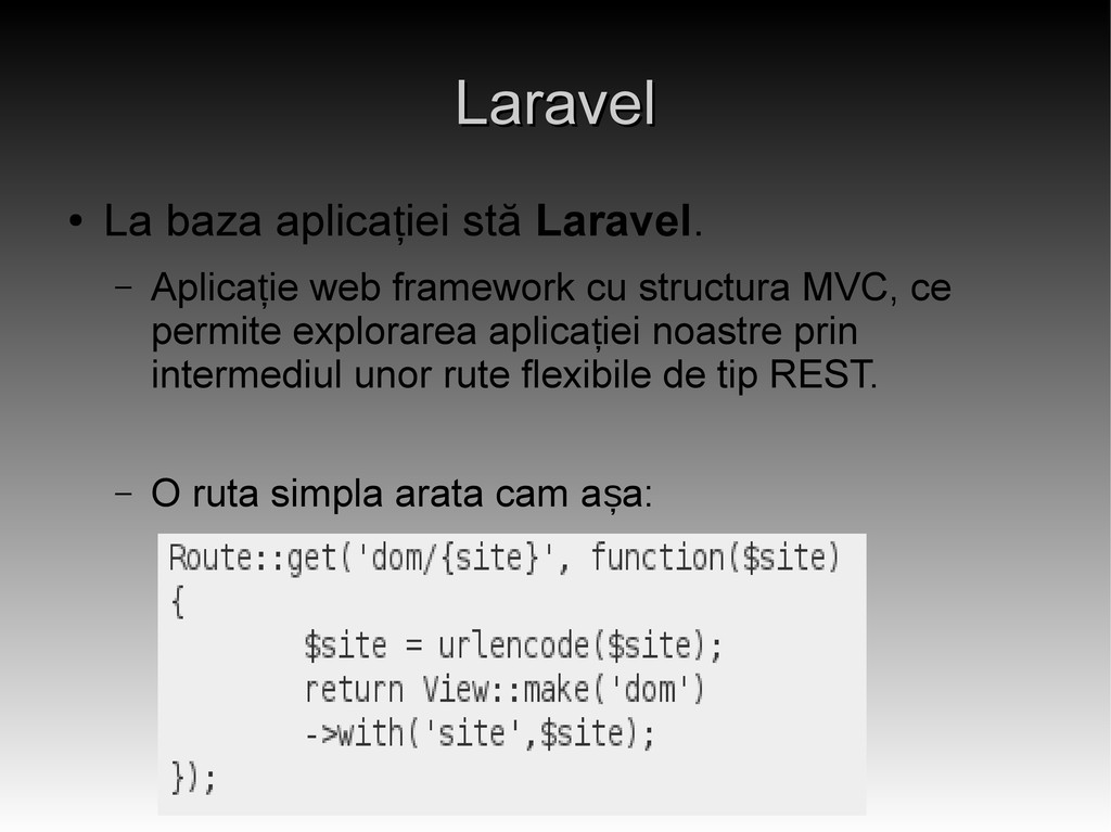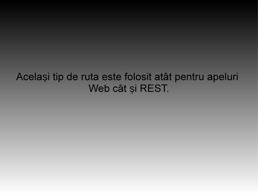 – Aplica ie web framework cu structura MVC, ce ț permite explorarea aplica iei noastre prin ț intermediul unor rute flexibile de tip REST. – O ruta simpla arata cam a a: ș