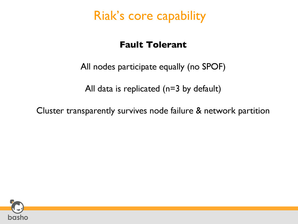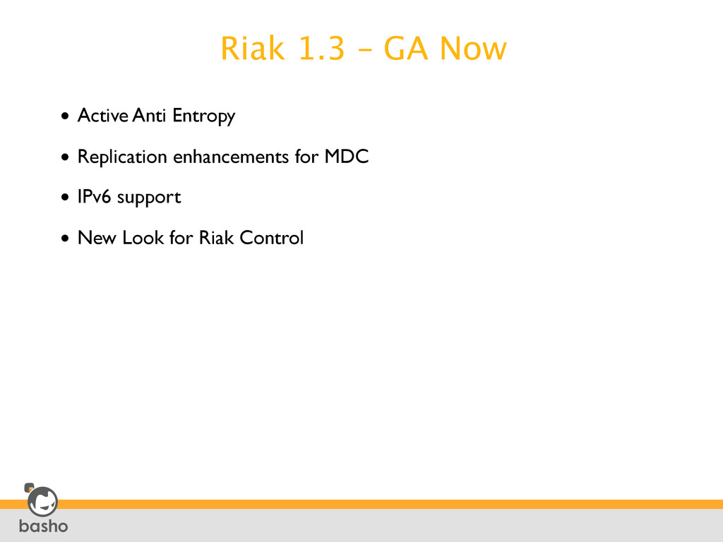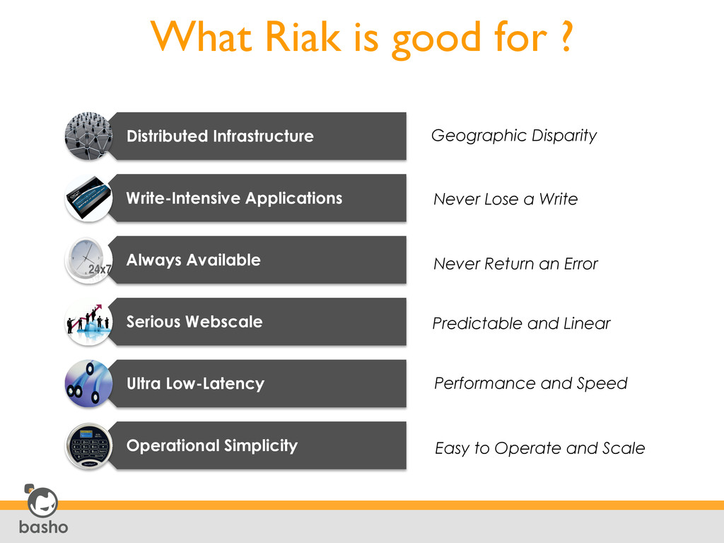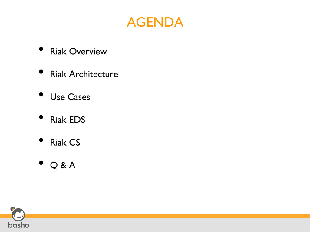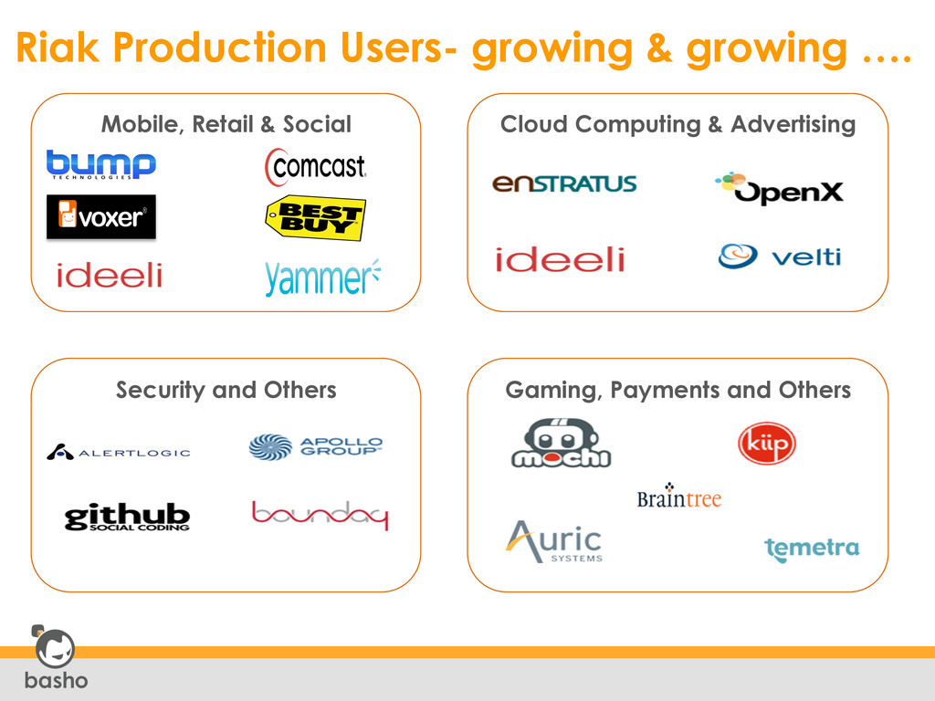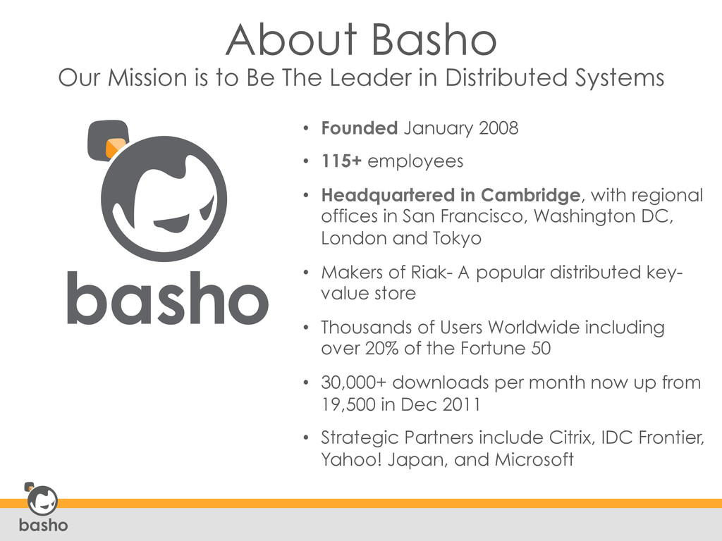 Distributed Systems • Founded January 2008 • 115+ employees • Headquartered in Cambridge, with regional offices in San Francisco, Washington DC, London and Tokyo • Makers of Riak- A popular distributed key- value store • Thousands of Users Worldwide including over 20% of the Fortune 50 • 30,000+ downloads per month now up from 19,500 in Dec 2011 • Strategic Partners include Citrix, IDC Frontier, Yahoo! Japan, and Microsoft