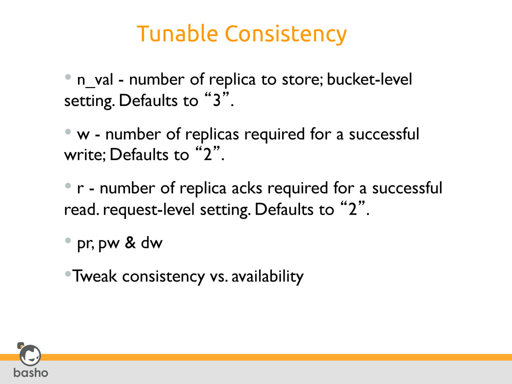 bucket-level setting. Defaults to “3”. • w - number of replicas required for a successful write; Defaults to “2”. • r - number of replica acks required for a successful read. request-level setting. Defaults to “2”. • pr, pw & dw • Tweak consistency vs. availability