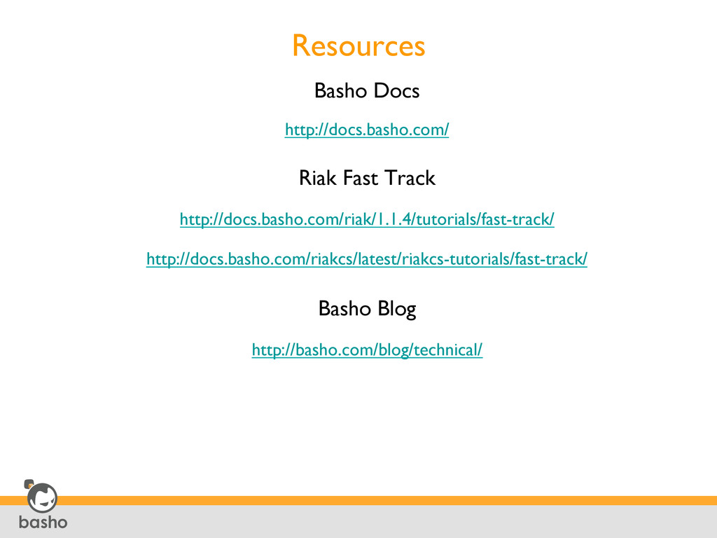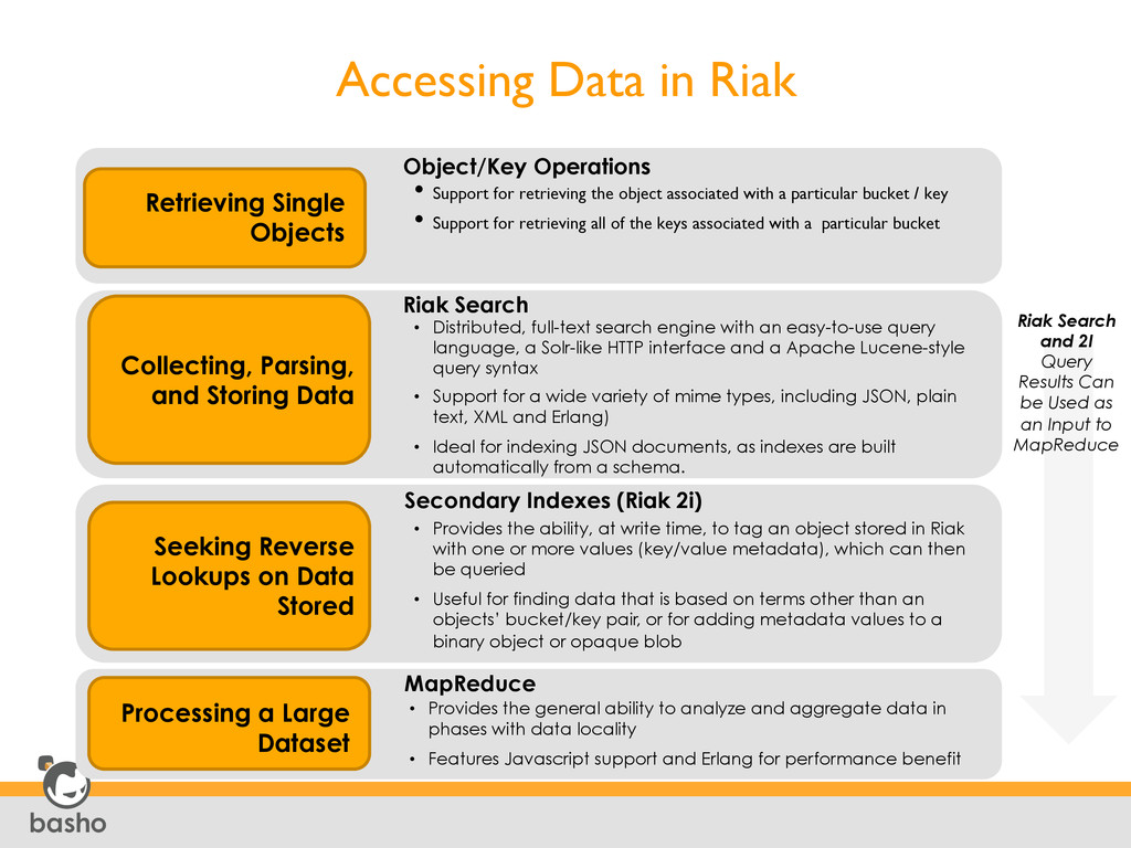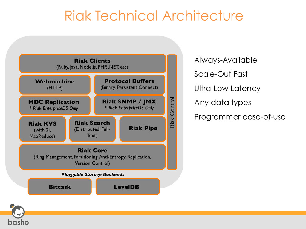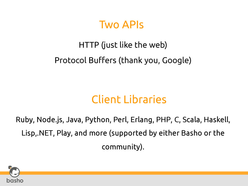 you, Google) Client Libraries Ruby, Node.js, Java, Python, Perl, Erlang, PHP, C, Scala, Haskell, Lisp,.NET, Play, and more (supported by either Basho or the community).