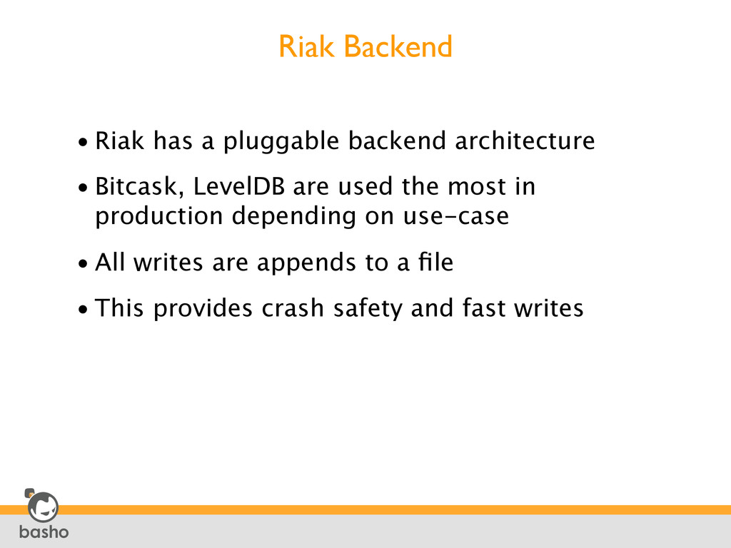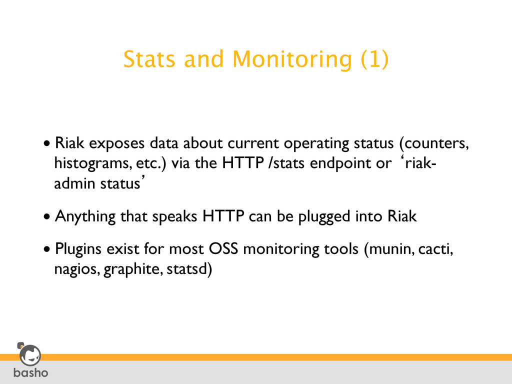 status (counters, histograms, etc.) via the HTTP /stats endpoint or ‘riak- admin status’ • Anything that speaks HTTP can be plugged into Riak • Plugins exist for most OSS monitoring tools (munin, cacti, nagios, graphite, statsd)