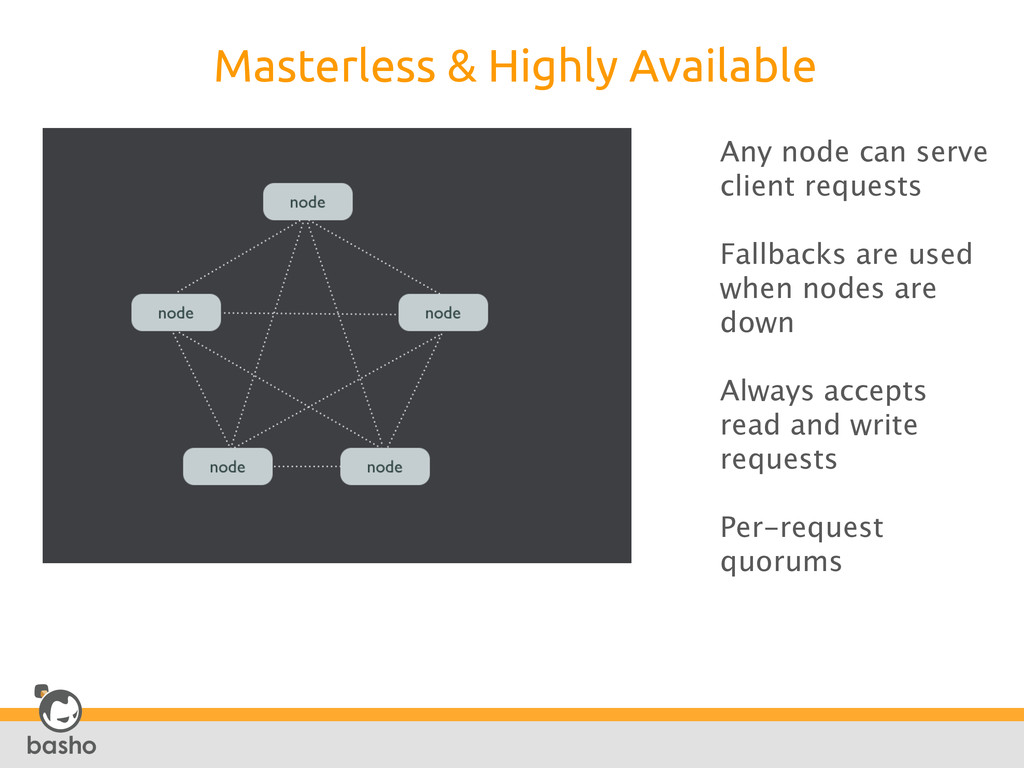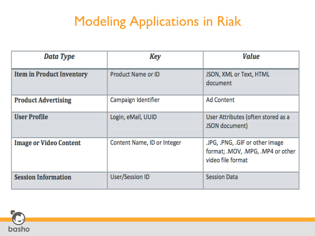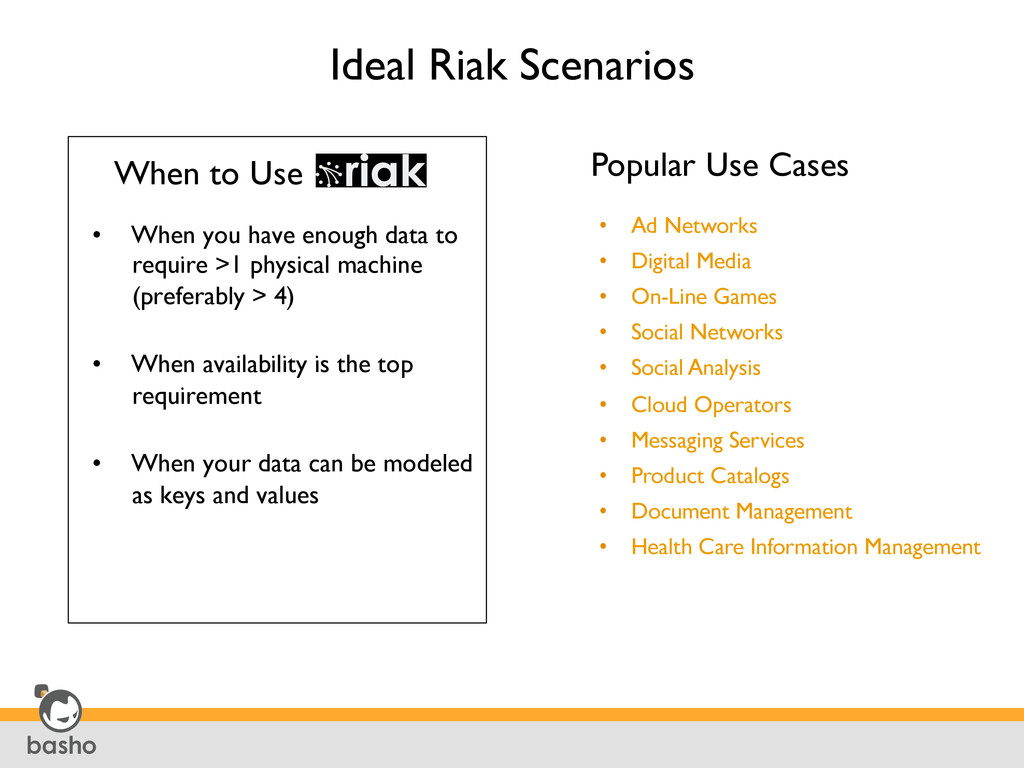 require >1 physical machine (preferably > 4) • When availability is the top requirement • When your data can be modeled as keys and values When to Use Popular Use Cases • Ad Networks • Digital Media • On-Line Games • Social Networks • Social Analysis • Cloud Operators • Messaging Services • Product Catalogs • Document Management • Health Care Information Management
