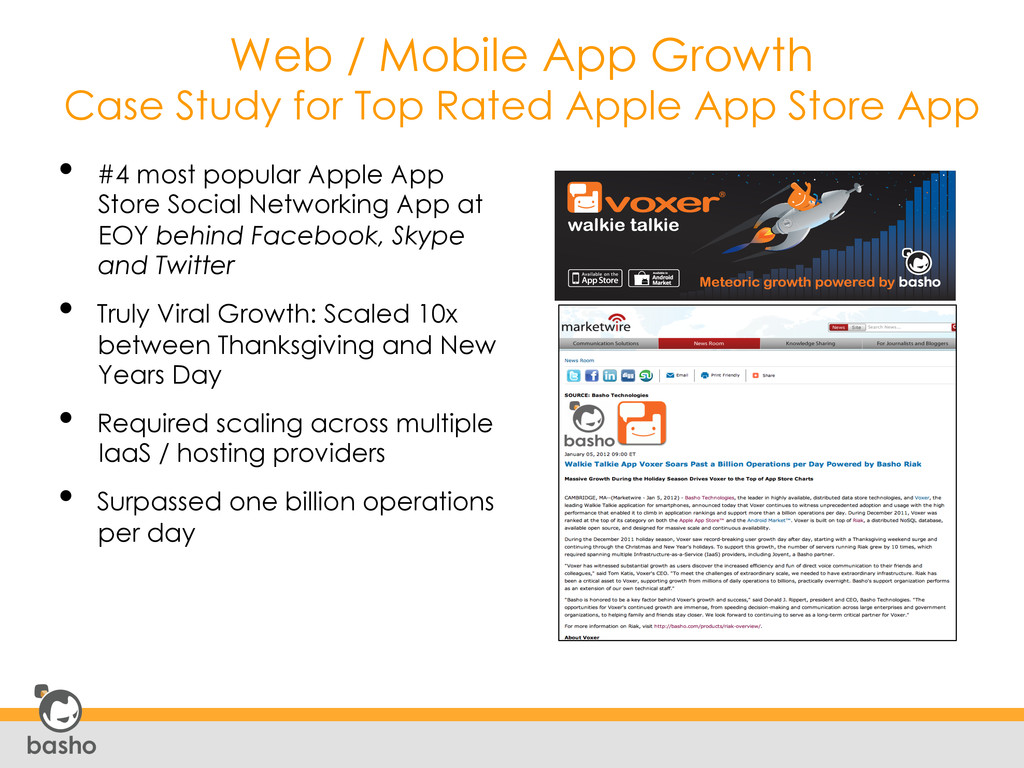 Apple App Store App • #4 most popular Apple App Store Social Networking App at EOY behind Facebook, Skype and Twitter • Truly Viral Growth: Scaled 10x between Thanksgiving and New Years Day • Required scaling across multiple IaaS / hosting providers • Surpassed one billion operations per day