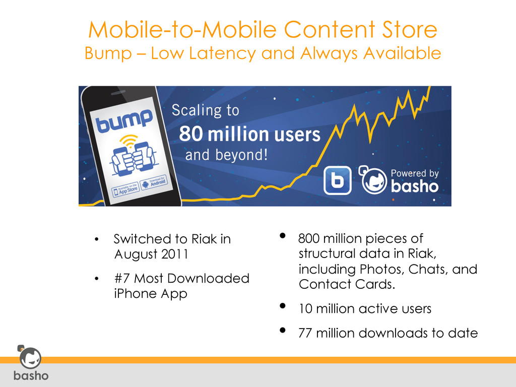 • 800 million pieces of structural data in Riak, including Photos, Chats, and Contact Cards. • 10 million active users • 77 million downloads to date • Switched to Riak in August 2011 • #7 Most Downloaded iPhone App