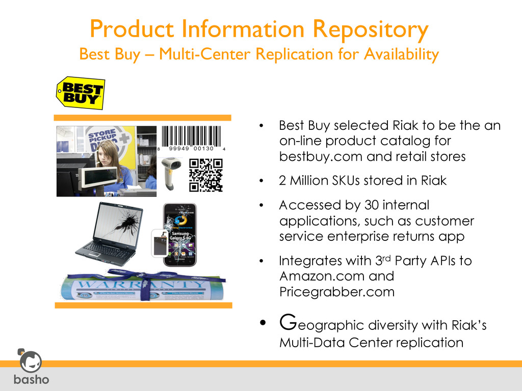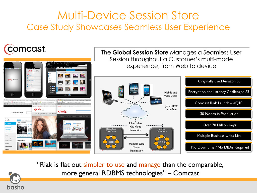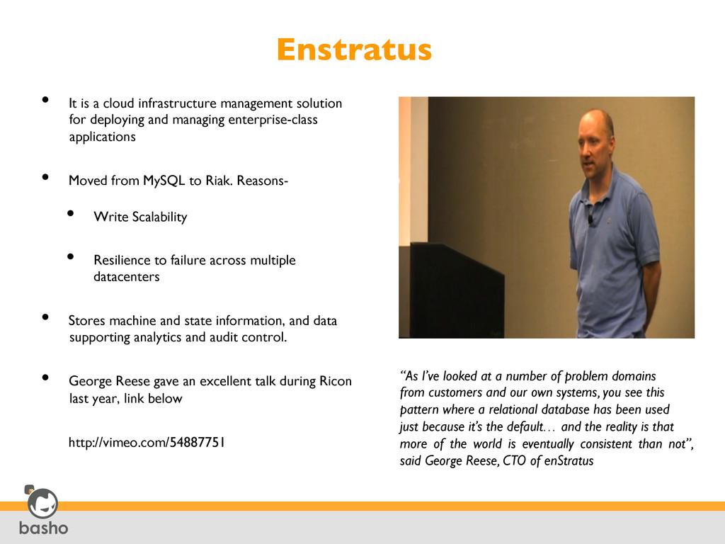 deploying and managing enterprise-class applications • Moved from MySQL to Riak. Reasons- • Write Scalability • Resilience to failure across multiple datacenters • Stores machine and state information, and data supporting analytics and audit control. • George Reese gave an excellent talk during Ricon last year, link below http://vimeo.com/54887751 “As I’ve looked at a number of problem domains from customers and our own systems, you see this pattern where a relational database has been used just because it’s the default… and the reality is that more of the world is eventually consistent than not”, said George Reese, CTO of enStratus