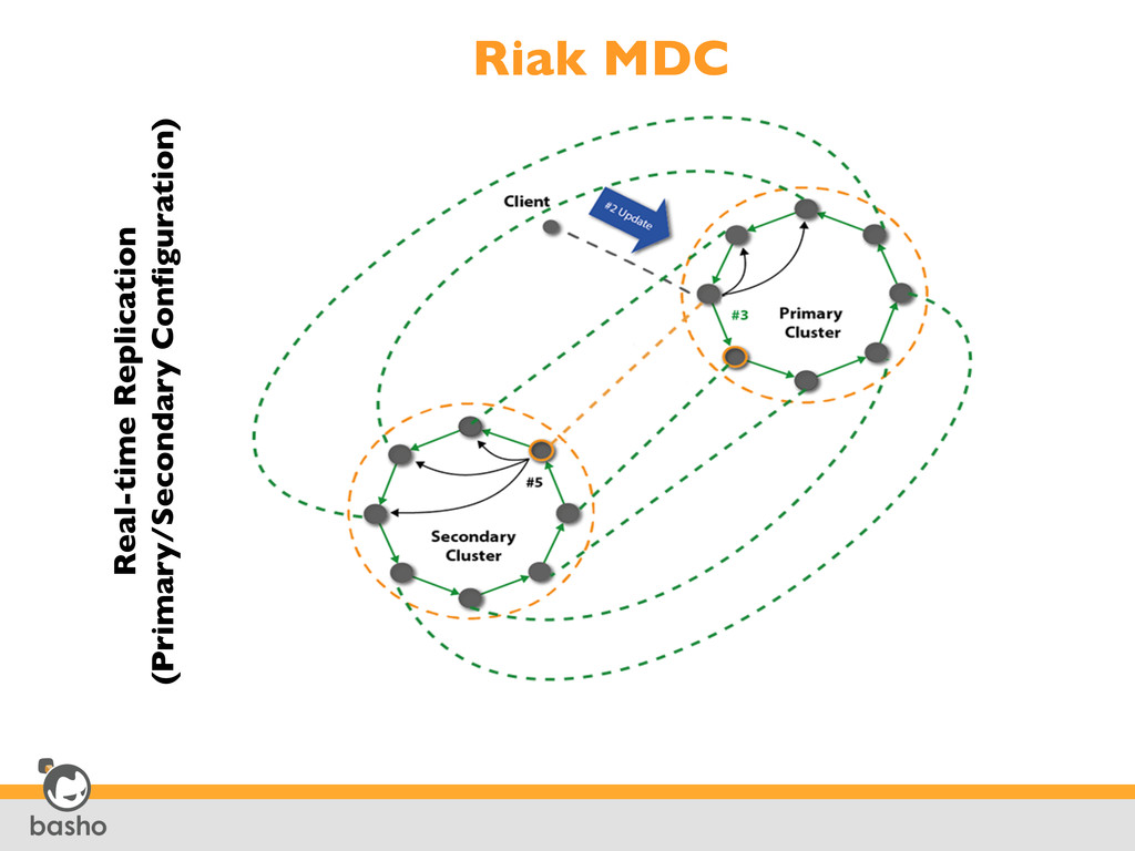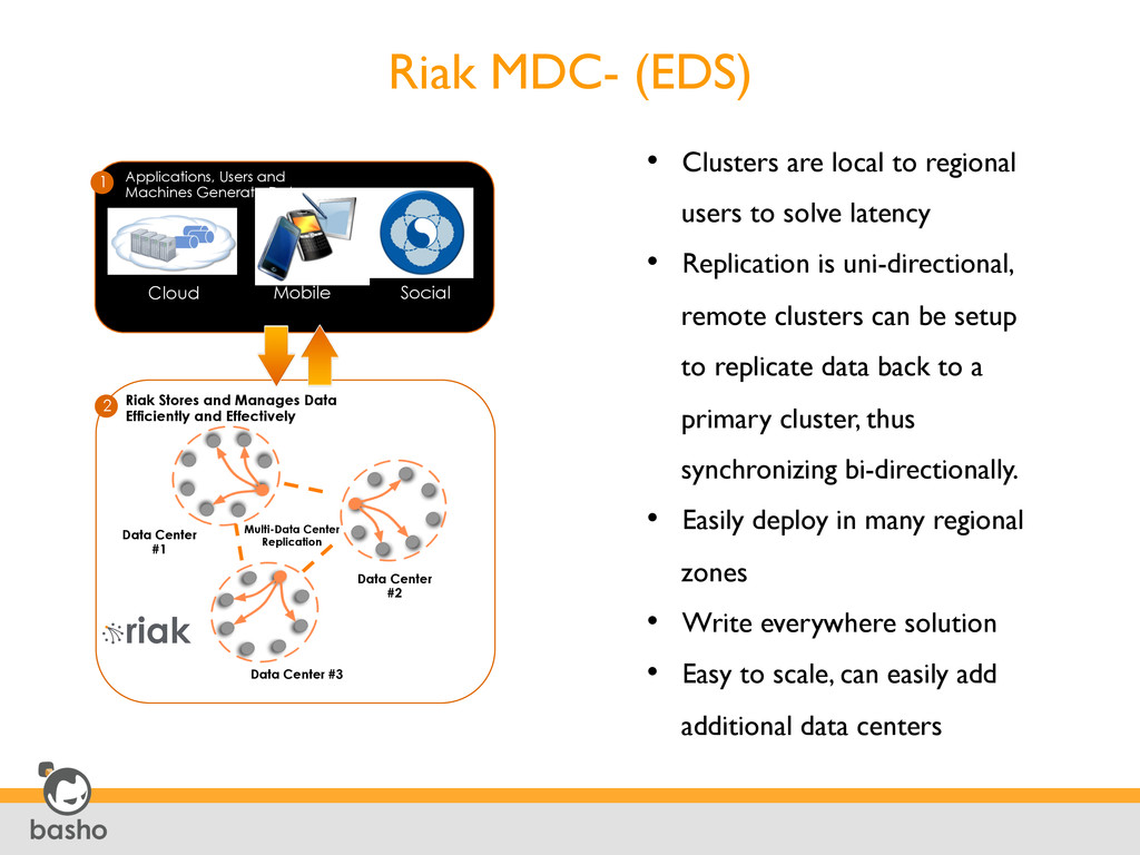 Center #3 Data Center #1 Multi-Data Center Replication Applications, Users and Machines Generate Data 1 2 Riak Stores and Manages Data Efficiently and Effectively • Clusters are local to regional users to solve latency • Replication is uni-directional, remote clusters can be setup to replicate data back to a primary cluster, thus synchronizing bi-directionally. • Easily deploy in many regional zones • Write everywhere solution • Easy to scale, can easily add additional data centers