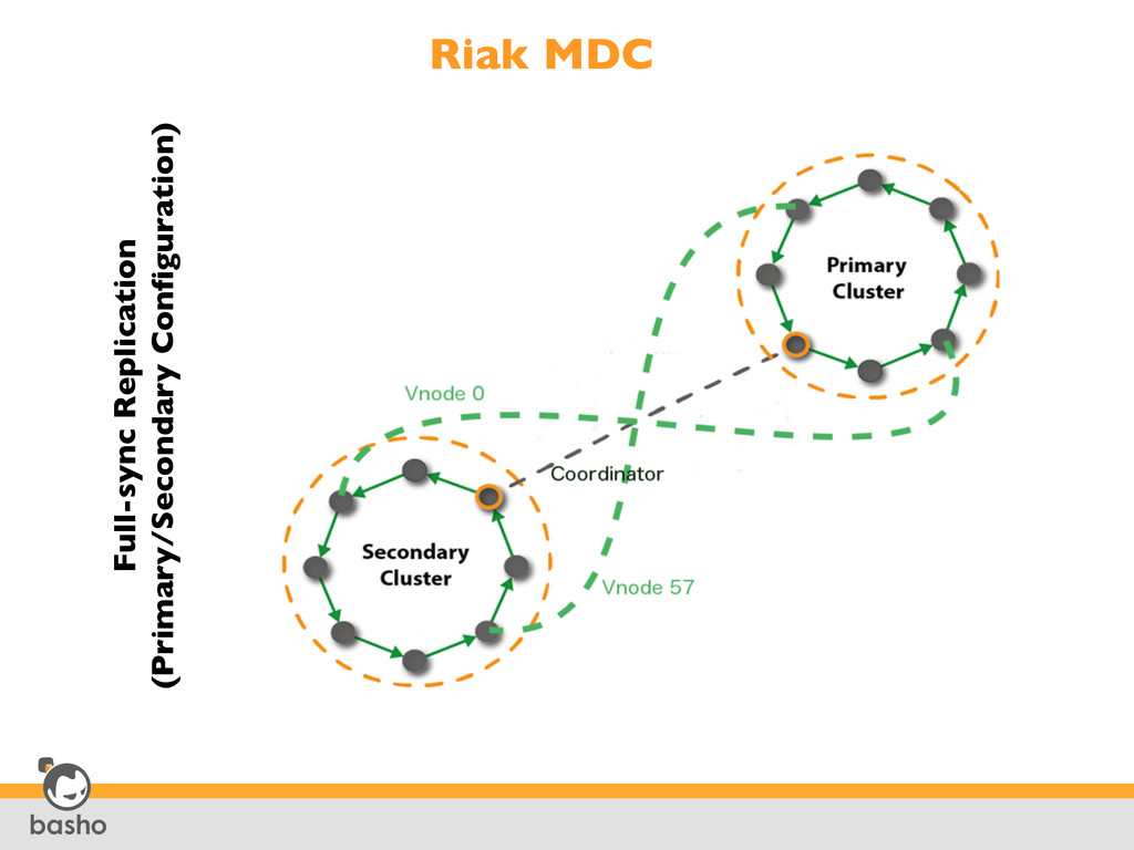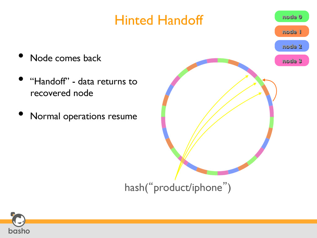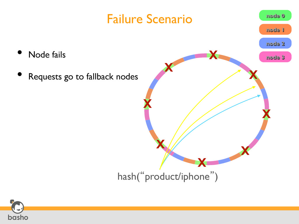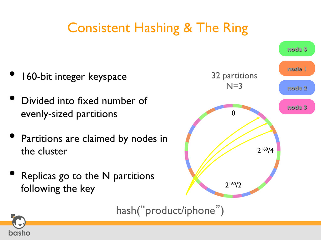 Divided into fixed number of evenly-sized partitions • Partitions are claimed by nodes in the cluster • Replicas go to the N partitions following the key 32 partitions N=3 node 0 node 1 node 2 node 3 hash(“product/iphone”) 2160/4 2160/2 0