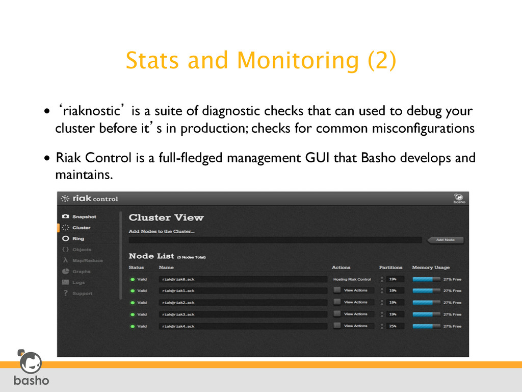diagnostic checks that can used to debug your cluster before it’s in production; checks for common misconfigurations • Riak Control is a full-fledged management GUI that Basho develops and maintains.