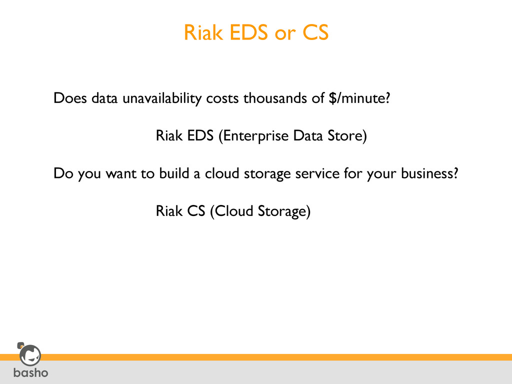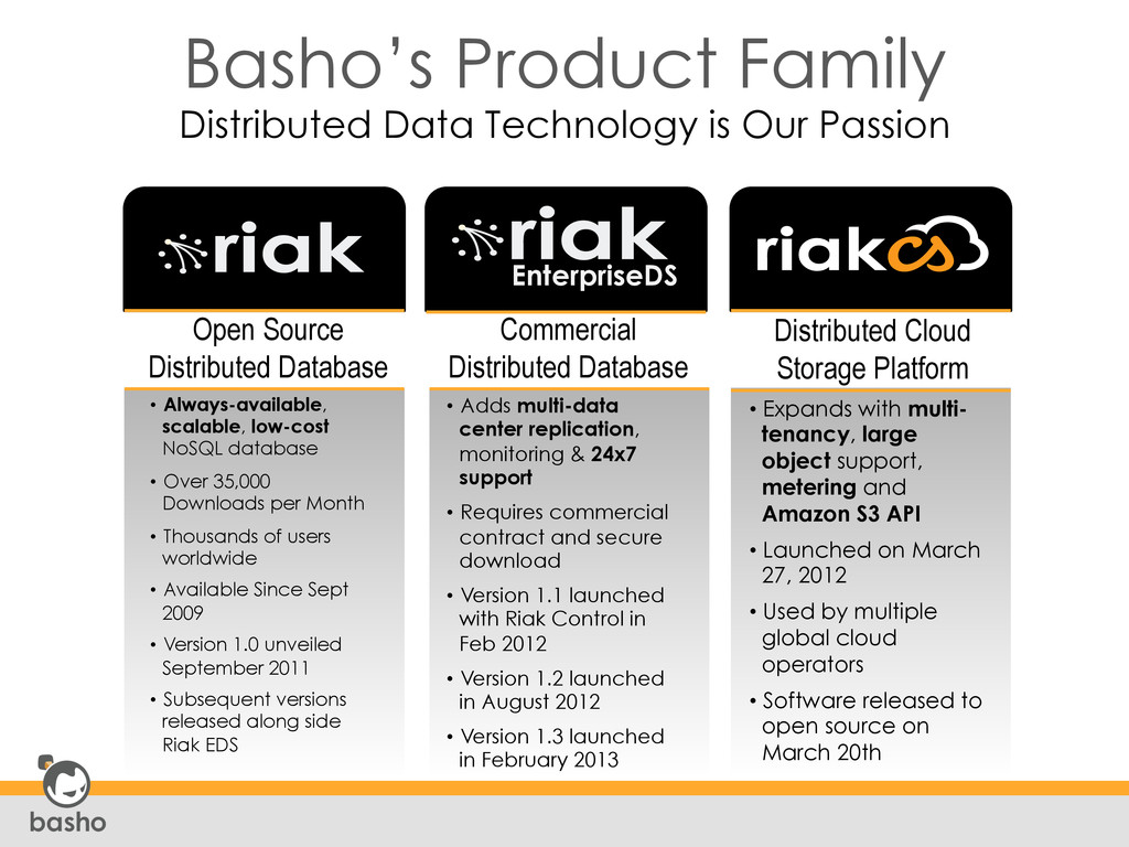 Open Source Distributed Database Commercial Distributed Database Distributed Cloud Storage Platform • Always-available, scalable, low-cost NoSQL database • Over 35,000 Downloads per Month • Thousands of users worldwide • Available Since Sept 2009 • Version 1.0 unveiled September 2011 • Subsequent versions released along side Riak EDS • Adds multi-data center replication, monitoring & 24x7 support • Requires commercial contract and secure download • Version 1.1 launched with Riak Control in Feb 2012 • Version 1.2 launched in August 2012 • Version 1.3 launched in February 2013 • Expands with multi- tenancy, large object support, metering and Amazon S3 API • Launched on March 27, 2012 • Used by multiple global cloud operators • Software released to open source on March 20th