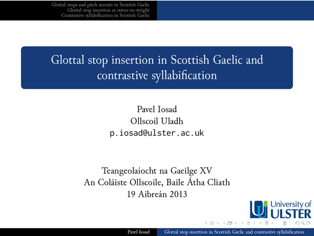 . .. . . . . .. . . . .. . . . .. . . . .. . . . . .. . . . .. . . . .. . . . .. . . . . .. . . . .. . . . .. . . . .. . . . . .. . . . .. . . . . .. . . . .. . . . .. . Glottal stops and pitch accents in Scottish Gaelic Glottal stop insertion as stress-to-weight Contrastive syllabification in Scottish Gaelic Glottal stop insertion is phonological The glottal stop is a moraic coda The prosodic affiliation of the glottal stop Smith (1999) proposes that glottal stop insertion is triggered by stress-to-weight In other words, [ʔ] is a coda This is important in cases like [poʔo] bodha: VC.V syllabification? Argued to be impossible VC.V syllabification can be reported by speakers (Ní Chiosáin, Welby, and Espesser 2012) But examples of core phonological phenomena involving it are more difficult to find I argue that southern Gaelic is an example Pavel Iosad Glottal stop insertion in Scottish Gaelic and contrastive syllabification