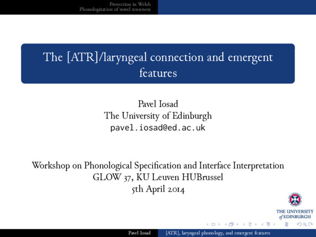 . .. . . . . .. . . . .. . . . .. . . . .. . . . . .. . . . .. . . . .. . . . .. . . . . .. . . . .. . . . .. . . . .. . . . . .. . . . .. . . . . .. . . . .. . . . .. . Provection in Welsh Phonologization of vowel tenseness Contrastive and redundant tenseness Tenseness and provection Conclusion: phonologization, emergent features, and substance II In our case, there is a phonetic case for [+ATR] vowels to be associated with [(+)voice] in obstruents, as seen e. g. in Buchan Scots However, if the language does not provide a [(+)voice] phonological category, it is not available to interact with tenseness, so it can be conceptualized as a different type of feature (aperture, or perhaps a new category like [ATR]), or it can latch onto the laryngeal feature that the language does offer Under these assumptions, a theory of phonologization should allow for both ‘natural’ and ‘substance-free’ patterns Pavel Iosad [ATR], laryngeal phonology, and emergent features