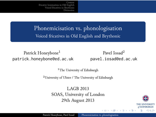 . .. . . . . .. . . . .. . . . .. . . . .. . . . . .. . . . .. . . . .. . . . .. . . . . .. . . . .. . . . .. . . . .. . . . . .. . . . .. . . . . .. . . . .. . . . .. . Context Fricative lenisisation in Old English Voiced fricatives in Brythonic Discussion Fricative voicing as lenition Theoretical consequences Conclusions Both Old English and Brythonic Celtic acquired voiced fricatives through a phonological process of lenition In both languages the phonological pattern produced (almost) predictable surface distributions for voiced fricatives for a fair length of time This does not falsify the Contrastivist Hypothesis, but follows from the existence of the phonological life cycle Thank you! Patrick Honeybone, Pavel Iosad Phonemicisation vs. phonologisation