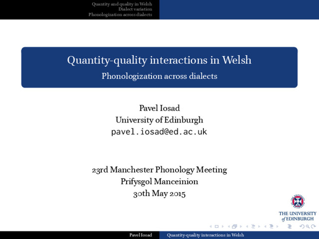 . . . . . . . . . . . . . . . . . . . . . . . . . . . . . . Quantity and quality in Welsh Dialect variation Phonologization across dialects Outline Length and quality: mutually predictable distributions in Welsh — and a contrastivist conundrum Phonologization of quality: evidence and criteria South-West Welsh: a different dialect Dialect variation in feature specification: contrast and emergent features Where does contrast come from? Pavel Iosad Quantity-quality interactions in Welsh