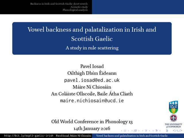 . . . . . . . . . . . . . . . . . . . . . . . . . . . . . . Backness in Irish and Scottish Gaelic short vowels Acoustic study Phonological analysis Methods Results: vowel distribution Results: contrast or coarticulation Results: magnitude of coariculation Outline 1 Backness in Irish and Scottish Gaelic short vowels The basic pattern Previous work 2 Acoustic study Methods Results: vowel distribution Results: contrast or coarticulation Results: magnitude of coariculation 3 Phonological analysis The mechanism of complementary distribution Fronting, backing, and rule scattering http://bit.ly/ocp13-gaelic-irish Pavel Iosad, Máire Ní Chiosáin Vowel backness and palatalization in Irish and Scottish Gaelic