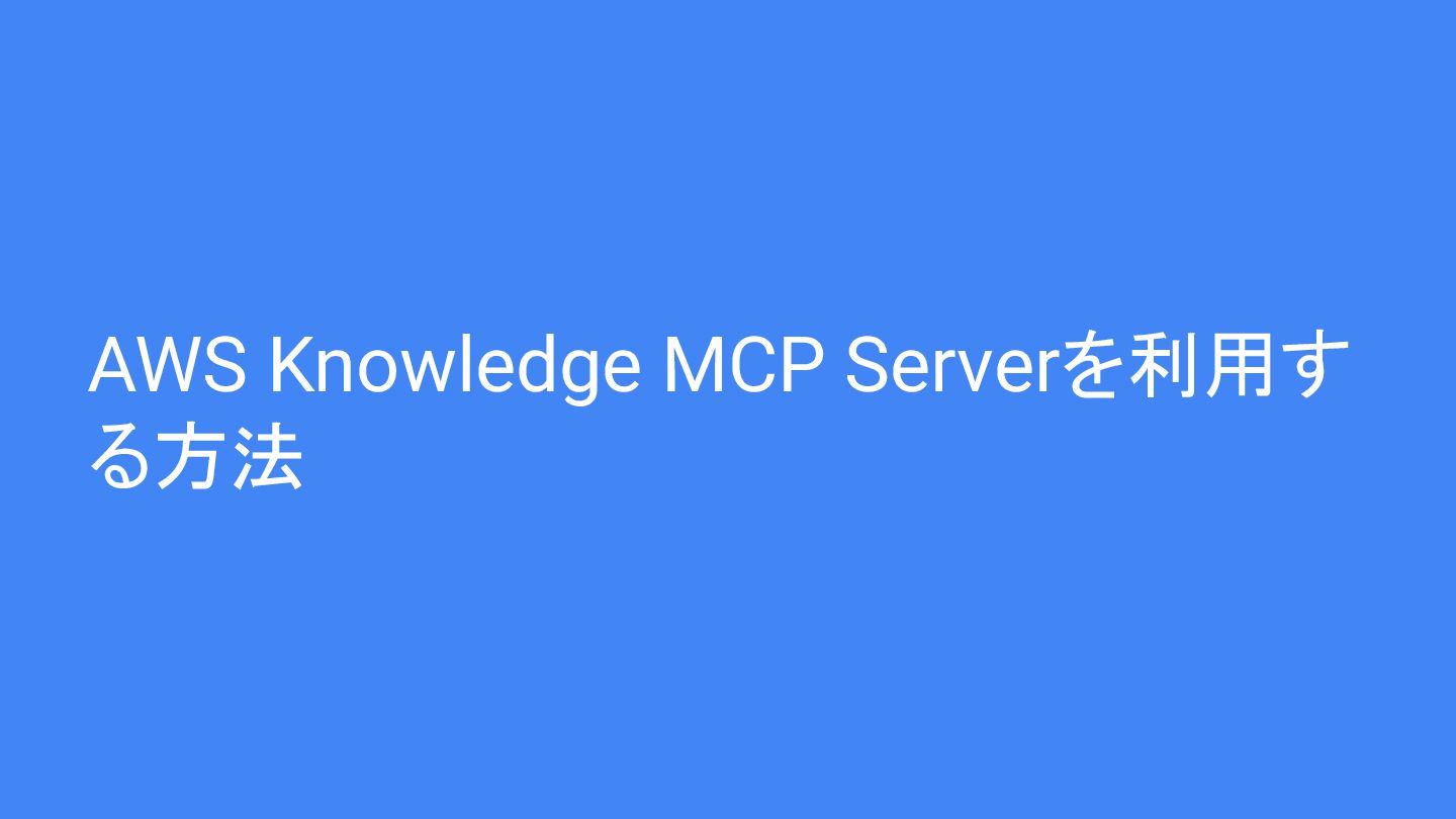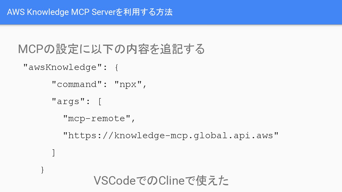 • 利用方法: MCPの設定に特定の"awsKnowledge"に関する内容を追記することで利用できます。