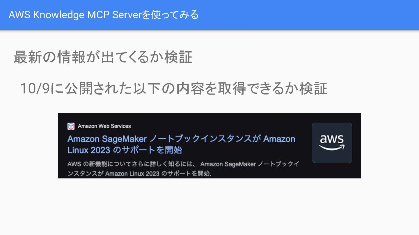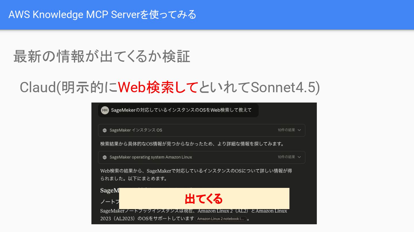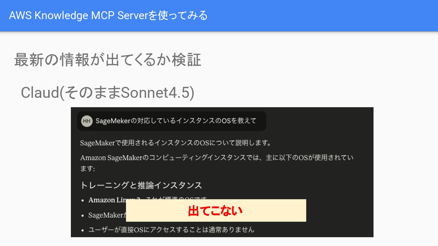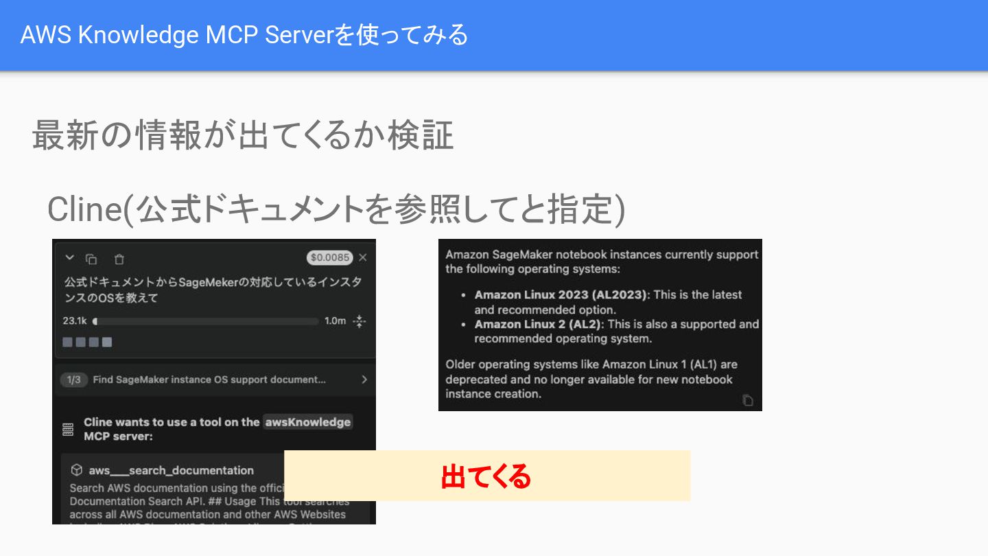 最新の情報が出てくるかどうかの検証では、通常のAI(例:Claud/Sonnet 4.5)では最新情報が取得できない場合があるのに対し、AWS Knowledge MCP Serverは公式ドキュメントを参照することで必要な情報を正確に取得できることが示されました。