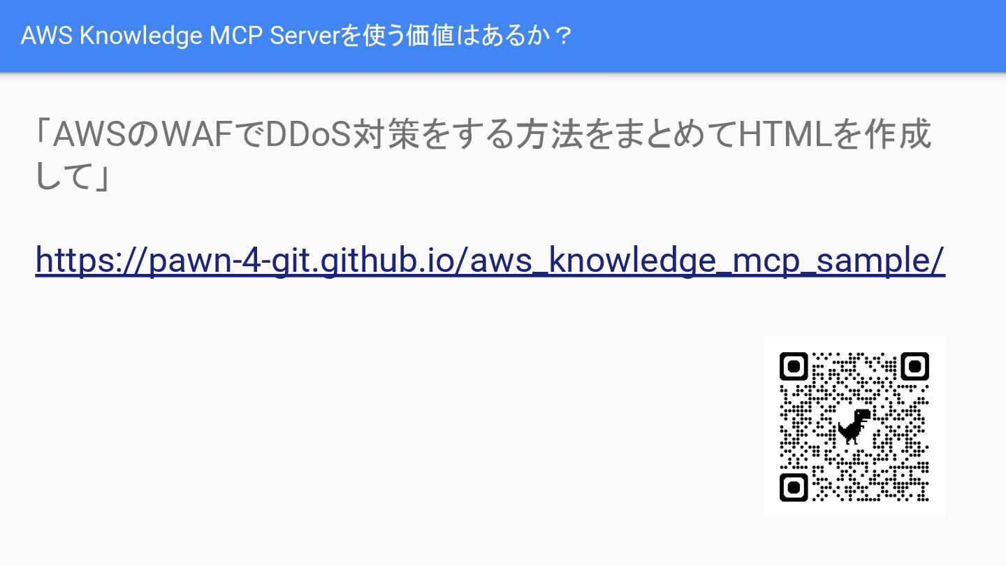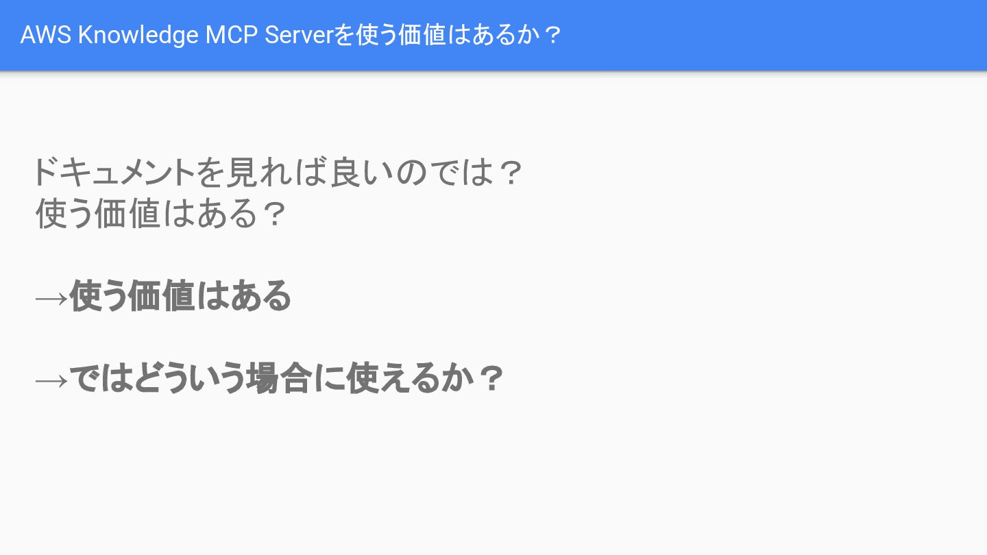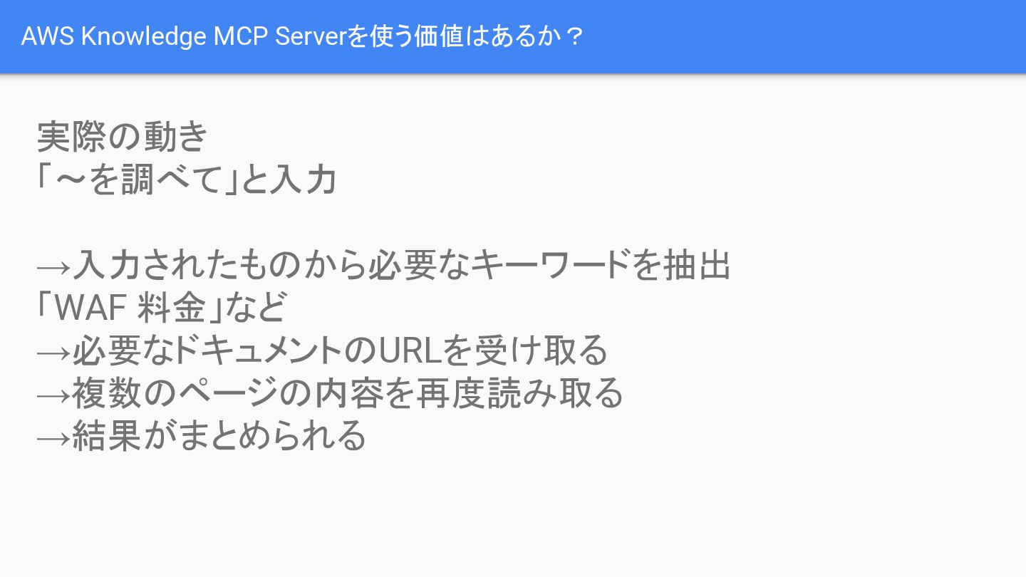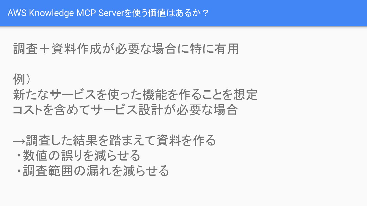 AWS Knowledge MCP Serverを利用する価値は、特に調査と資料作成が同時に必要な場合に発揮されます。
