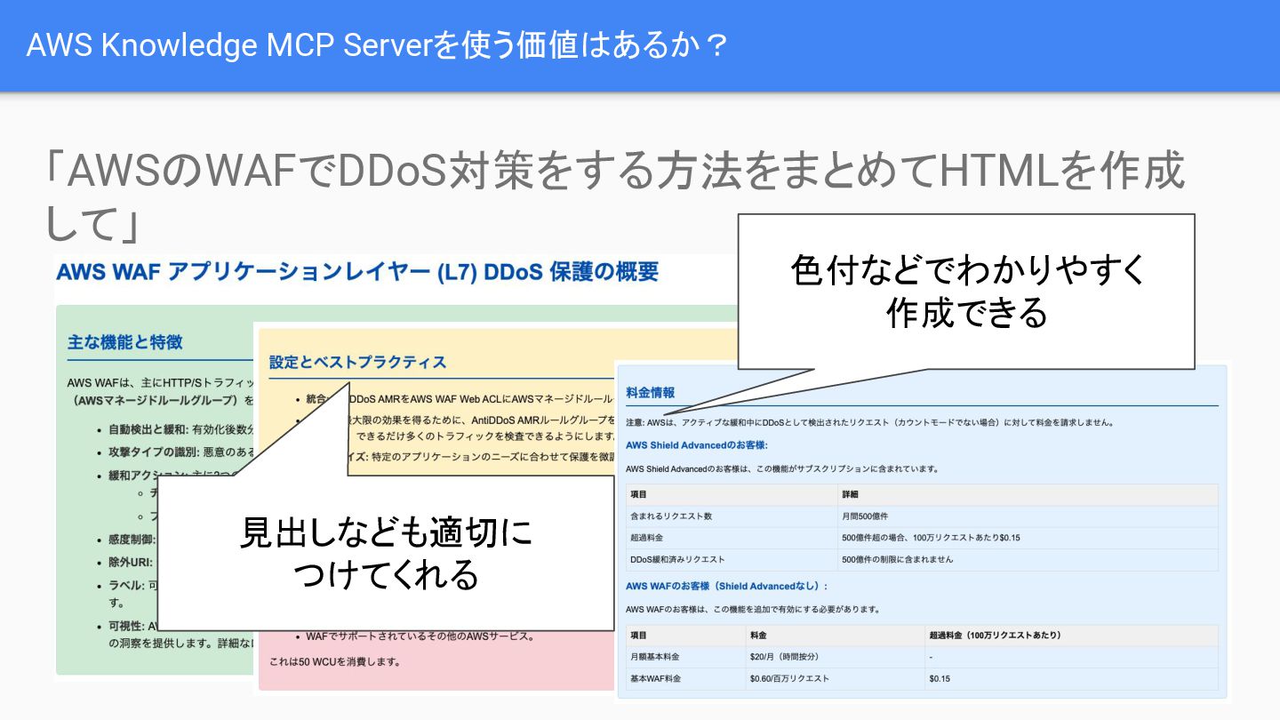 また、特定のクエリ(例:「AWSのWAFでDDoS対策をする方法をまとめてHTMLを作成して」)に対して、色付けや見出し付けが適切になされた、分かりやすいドキュメントを自動で作成できることも実証されています。