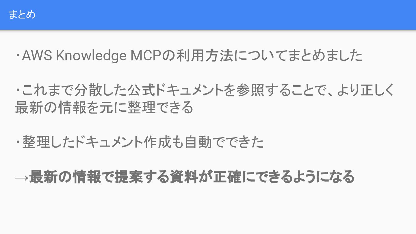 AWS Knowledge MCPを利用することで、これまで分散しがちだった公式ドキュメントやナレッジベースを一元的に参照し、より正しく最新の情報を元に整理することが可能です。さらに、その整理されたドキュメントの作成も自動でできるため、最新の情報に基づいた提案資料の正確性が向上することが期待されます