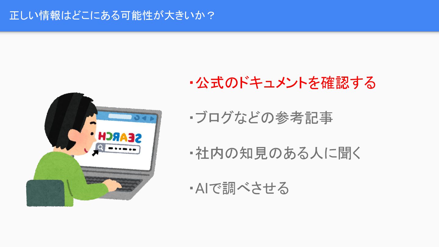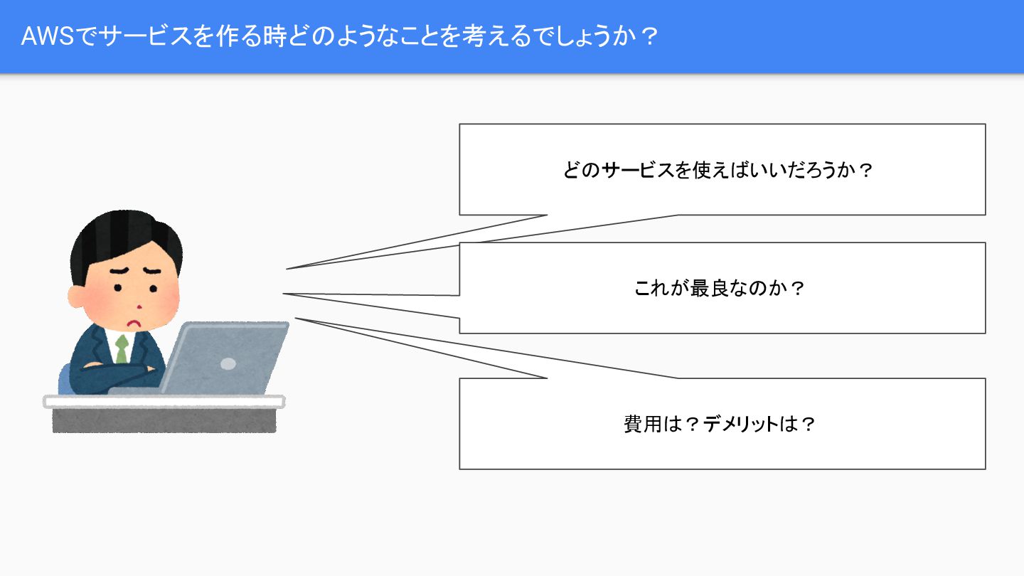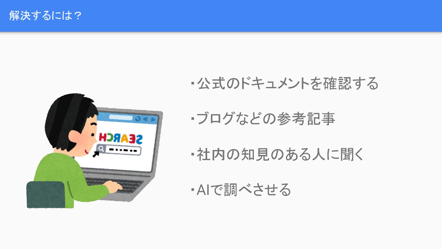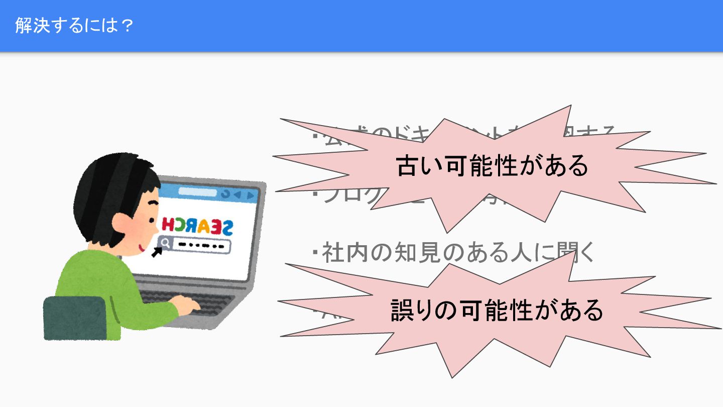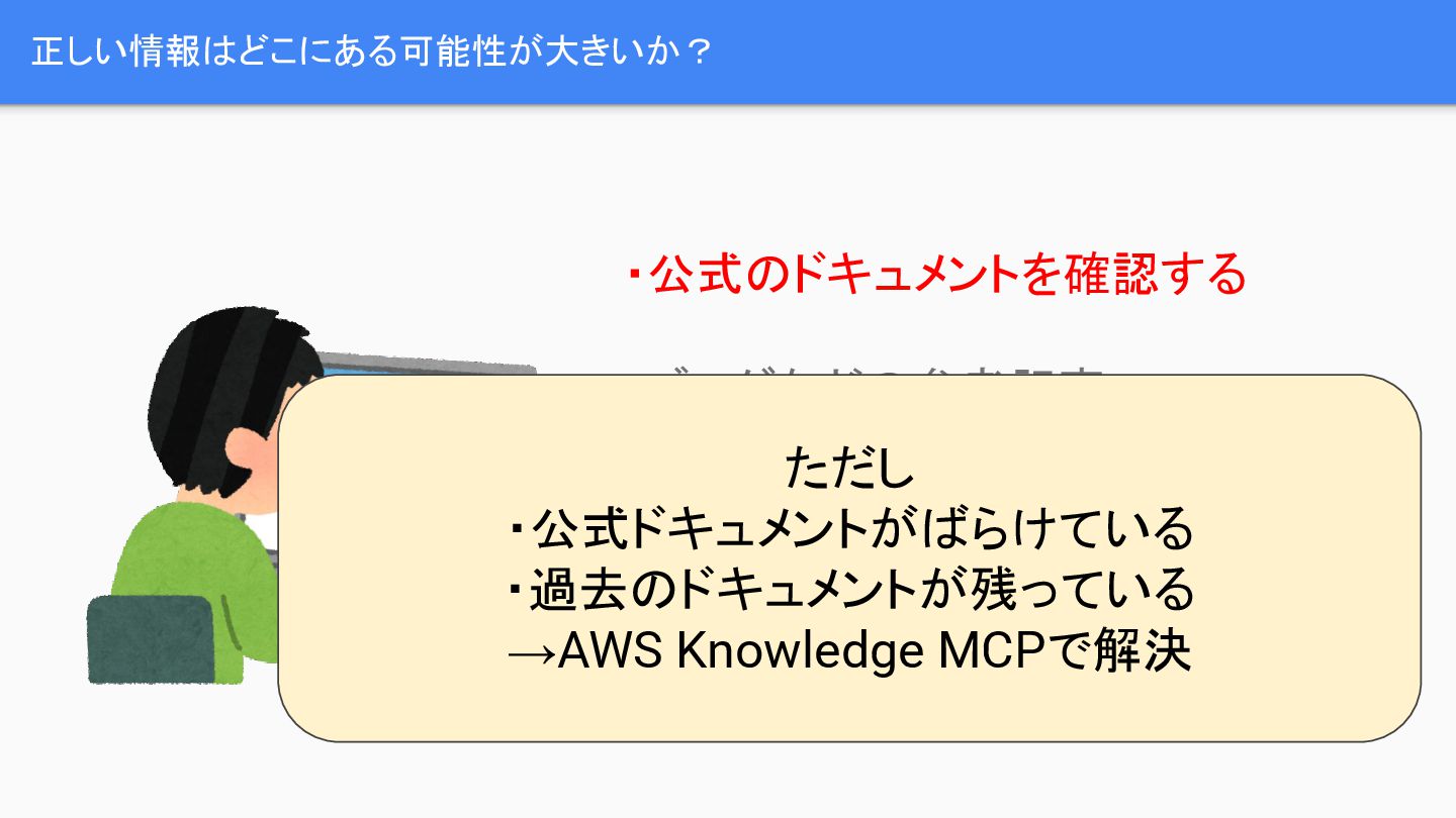 AWSを用いてサービスを構築する際、どのサービスが最適か、費用はどうか、デメリットは何かなど、多くの検討事項が発生します。これらの疑問を解決するため、開発者は公式ドキュメントの確認、ブログ記事の参照、社内の有識者への相談、あるいはAIによる調査といった手段を取りますが、これらの情報源は古い可能性や誤りの可能性を含んでいます。特に、AWSの公式ドキュメントは分散しており、過去の古いドキュメントが残存しているという課題があります。