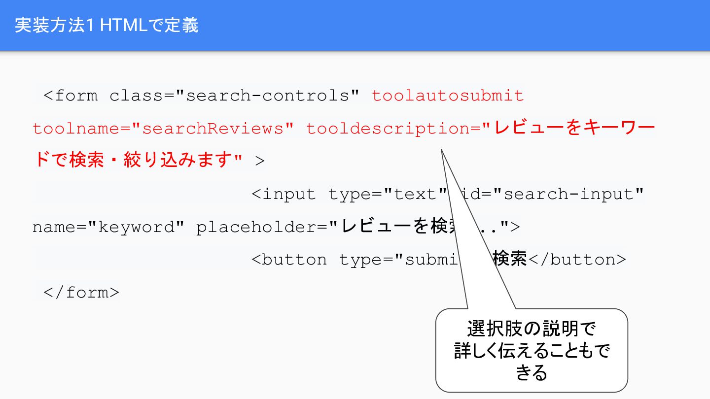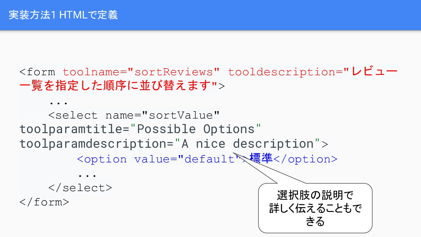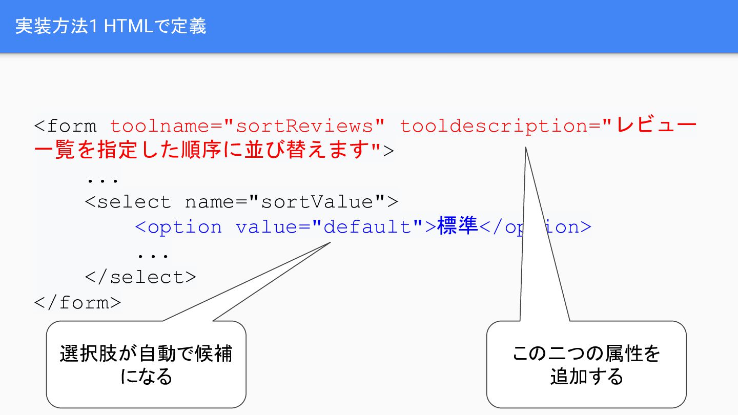 ratings, dates, and review comments from the product page.", inputSchema: { 入力の定義 }, outputSchema: { 出力の定義 }, execute: async function (params) { 処理} } window.navigator.modelContext.registerTool(getProductReviewsTool); 実装方法2 JavaScriptで定義 入出力や処理内容な どを定義 関数を参照できるよう にする
