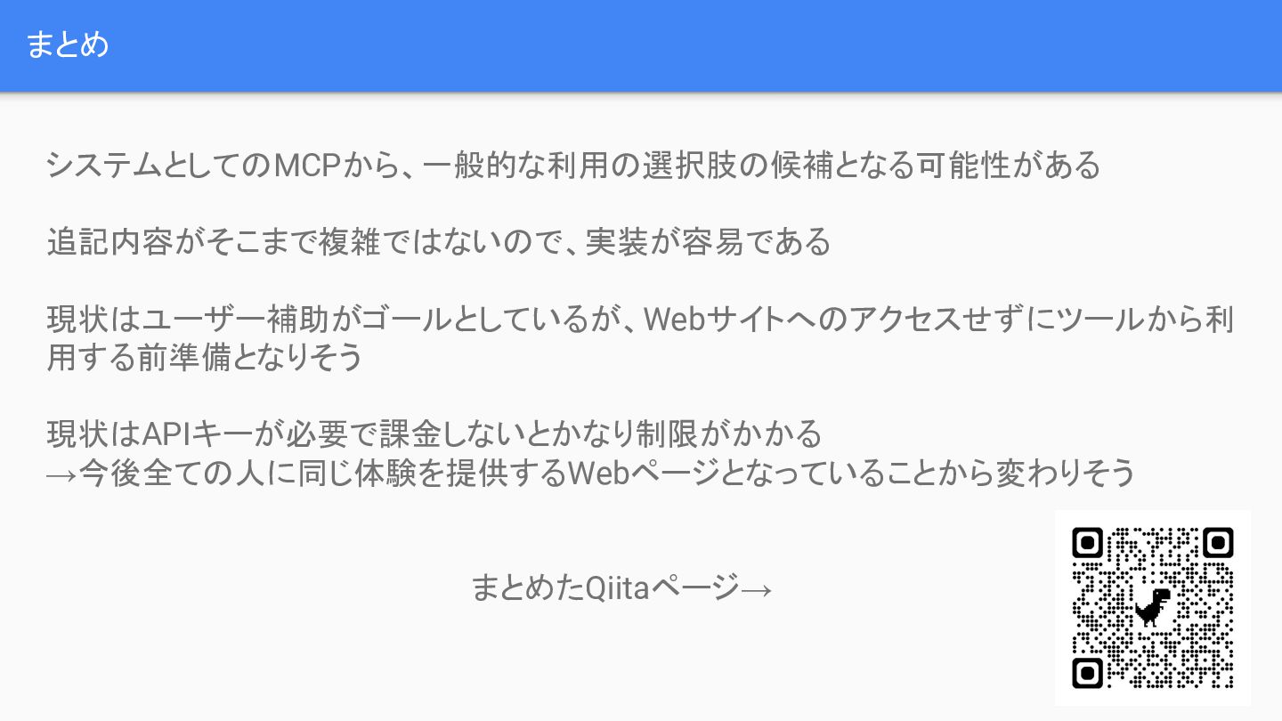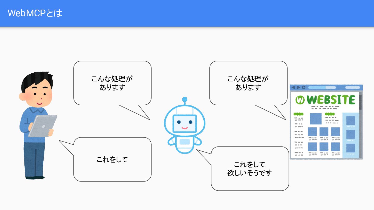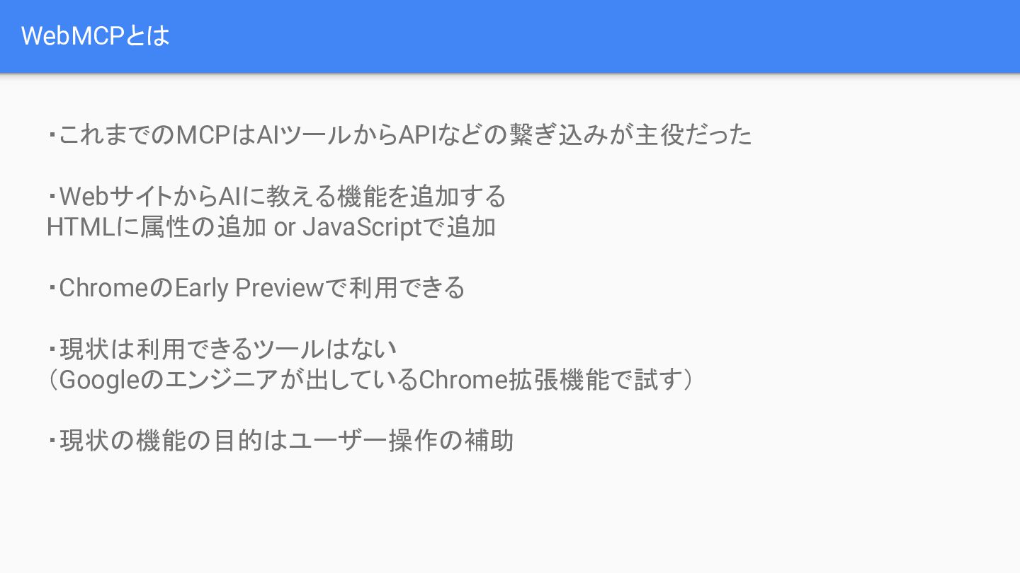 ratings, dates, and review comments from the product page.", inputSchema: { 入力の定義 }, outputSchema: { 出力の定義 }, execute: async function (params) { 処理} } window.navigator.modelContext.registerTool(getProductReviewsTool); 実装方法2 JavaScriptで定義 入出力や処理内容な どを定義 関数を参照できるよう にする