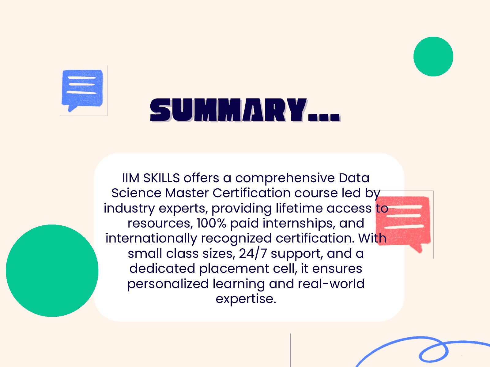 IIM SKILLS offers a comprehensive Data Science Master Certification course led by industry experts, providing lifetime access to resources, 100% paid internships, and internationally recognized certification. With small class sizes, 24/7 support, and a dedicated placement cell, it ensures personalized learning and real-world expertise.