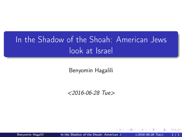 at Israel CoverPage - Beinart - Mallet - Wisse - Dershowitz 1991 Michels "Is America different?" Even the choice term, shoah or holocaust, reveals something about one’s orientation to Hebrew and the post-WWII state of which it is the official language. This essay seeks to find attitudes about the holocaust in readings assigned as exemplary of American Jews’ attitudes towards Israel at the Ben-Gurion University in 2016. This is my first presentation made with org-mode. The code is here: gist Grandmother saw communities disappear, felt better because of the existence of Israel. Benyomin Hagalili In the Shadow of the Shoah: American Jews look at Israel <2016-06-28 Tue> 1 / 1