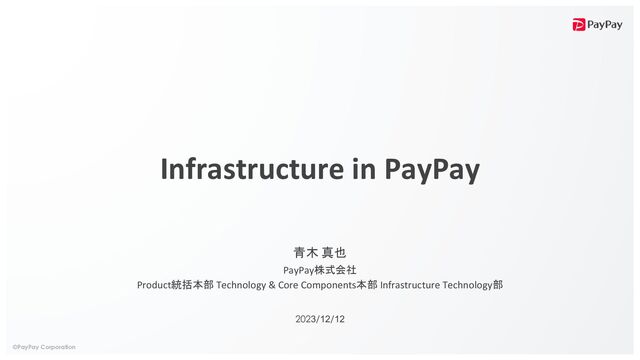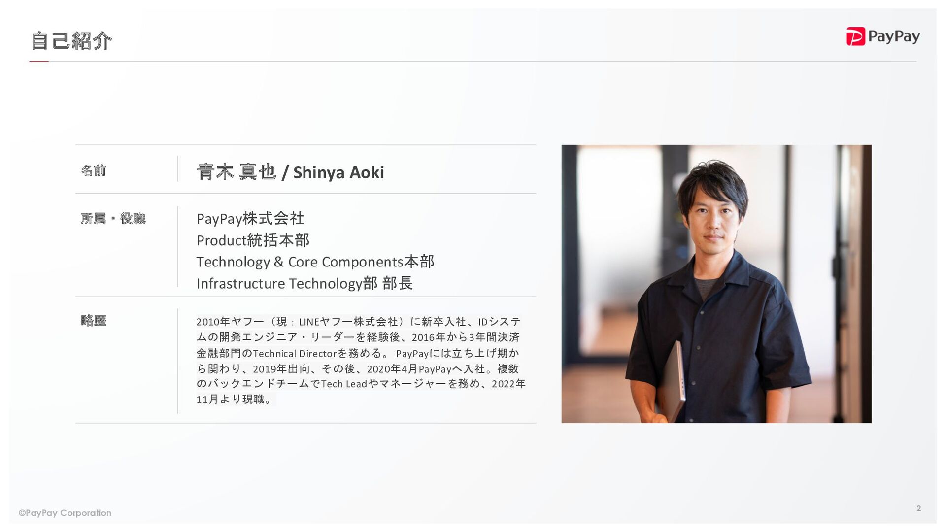 Aoki 名前 所属・役職 略歴 PayPay株式会社 Product統括本部 Technology & Core Components本部 Infrastructure Technology部 部長 2010年ヤフー(現:LINEヤフー株式会社)に新卒入社、IDシステ ムの開発エンジニア・リーダーを経験後、2016年から3年間決済 金融部門のTechnical Directorを務める。 PayPayには立ち上げ期か ら関わり、2019年出向、その後、2020年4月PayPayへ入社。複数 のバックエンドチームでTech Leadやマネージャーを務め、2022年 11月より現職。