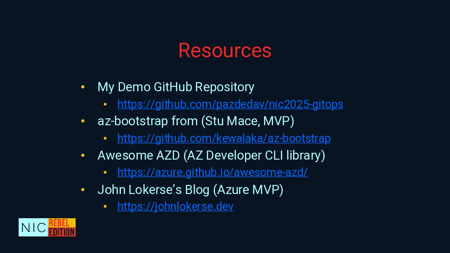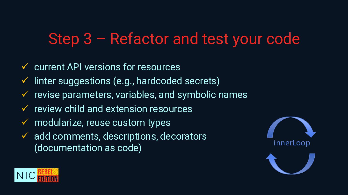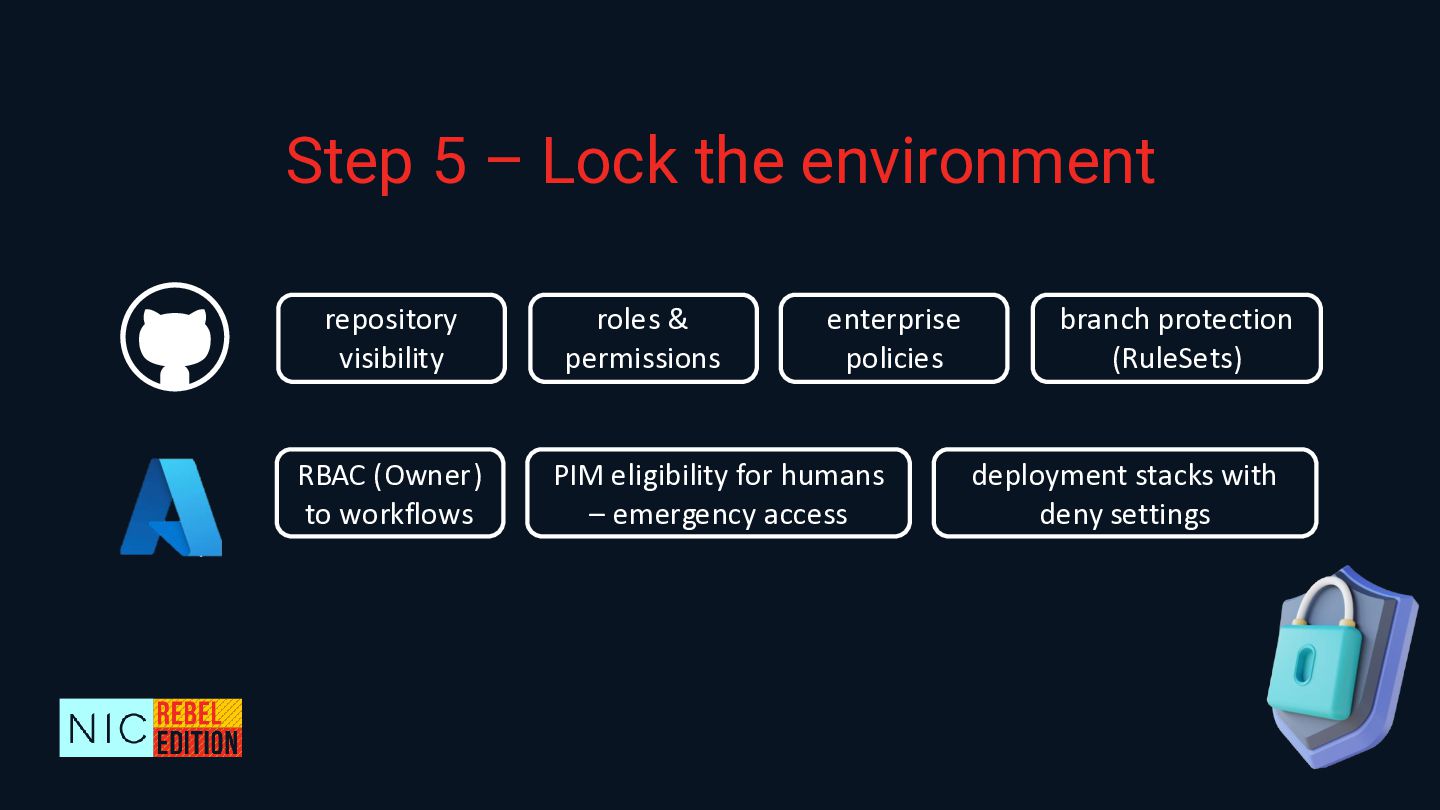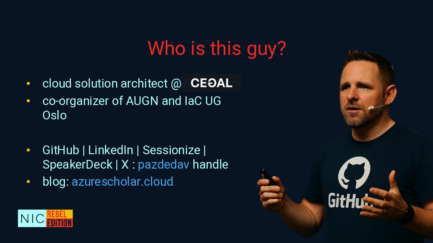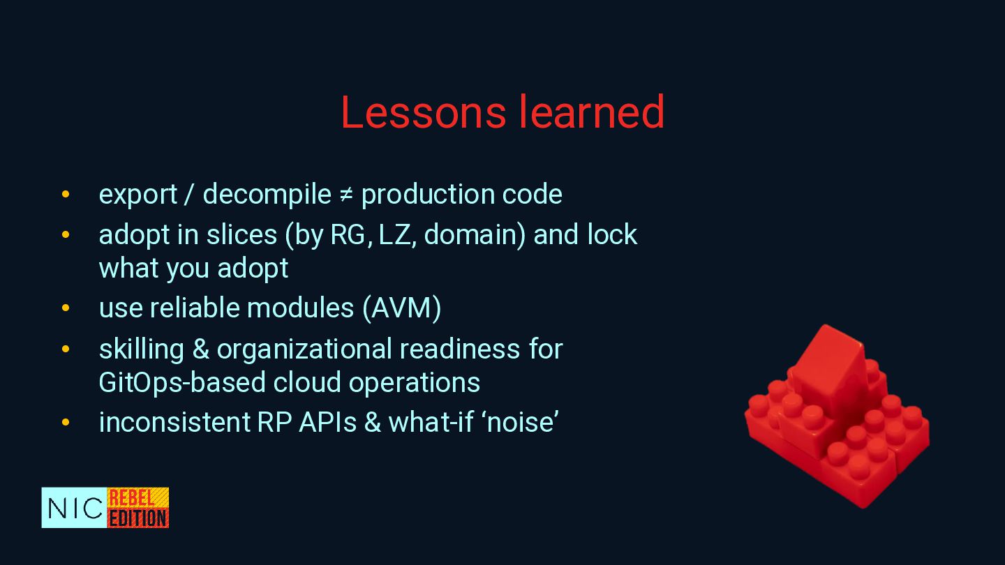 In this demo-heavy session, we’ll walk through how to reverse-engineer an existing Azure environment into a fully code-first setup by using a multi-stage process that involves AI-powered code refactoring with GitHub Copilot, ensuring best practices, leveraging Azure Verified Modules as building blocks, and boosting team productivity by using reusable GitHub repo templates and workflows with validation, security scanning, etc. As an important step, we will harden the environment to prevent configuration drifts and promote traceability and governance controls both in Azure and your coding environment.