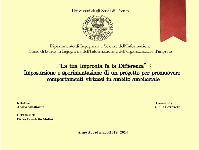 un progetto per promuovere comportamenti virtuosi in ambito ambientale Relatore: Laureanda: Adolfo Villafiorita Giulia Petronella Correlatore: Pietro Benedetto Molini Anno Accademico 2013- 2014 Università degli Studi di Trento Dipartimento di Ingegneria e Scienze dell'Informazione Corso di laurea in Ingegneria dell'Informazione e dell'organizzazione d'impresa