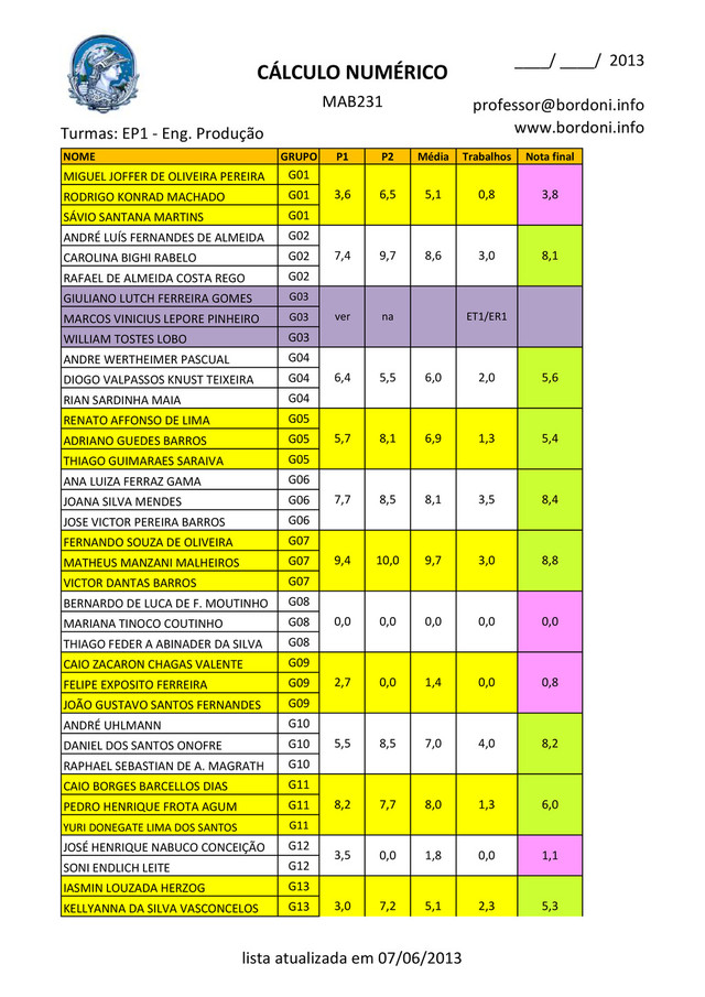 [email protected] www.bordoni.info NOME GRUPO P1 P2 Média Trabalhos Nota final MIGUEL JOFFER DE OLIVEIRA PEREIRA G01 RODRIGO KONRAD MACHADO G01 SÁVIO SANTANA MARTINS G01 ANDRÉ LUÍS FERNANDES DE ALMEIDA G02 CAROLINA BIGHI RABELO G02 RAFAEL DE ALMEIDA COSTA REGO G02 GIULIANO LUTCH FERREIRA GOMES G03 MARCOS VINICIUS LEPORE PINHEIRO G03 WILLIAM TOSTES LOBO G03 ANDRE WERTHEIMER PASCUAL G04 DIOGO VALPASSOS KNUST TEIXEIRA G04 RIAN SARDINHA MAIA G04 RENATO AFFONSO DE LIMA G05 ADRIANO GUEDES BARROS G05 THIAGO GUIMARAES SARAIVA G05 ANA LUIZA FERRAZ GAMA G06 JOANA SILVA MENDES G06 JOSE VICTOR PEREIRA BARROS G06 FERNANDO SOUZA DE OLIVEIRA G07 MATHEUS MANZANI MALHEIROS G07 VICTOR DANTAS BARROS G07 BERNARDO DE LUCA DE F. MOUTINHO G08 MARIANA TINOCO COUTINHO G08 THIAGO FEDER A ABINADER DA SILVA G08 CAIO ZACARON CHAGAS VALENTE G09 FELIPE EXPOSITO FERREIRA G09 JOÃO GUSTAVO SANTOS FERNANDES G09 ANDRÉ UHLMANN G10 DANIEL DOS SANTOS ONOFRE G10 RAPHAEL SEBASTIAN DE A. MAGRATH G10 CAIO BORGES BARCELLOS DIAS G11 PEDRO HENRIQUE FROTA AGUM G11 YURI DONEGATE LIMA DOS SANTOS G11 JOSÉ HENRIQUE NABUCO CONCEIÇÃO G12 SONI ENDLICH LEITE G12 IASMIN LOUZADA HERZOG G13 KELLYANNA DA SILVA VASCONCELOS G13 7,0 8,0 1,8 8,1 9,7 0,0 1,4 5,1 5,1 8,6 ET1/ER1 6,0 6,9 7,7 0,0 7,2 3,5 3,6 7,4 ver 6,4 5,7 7,7 9,4 0,0 2,7 5,5 8,2 0,0 8,5 6,5 9,7 na 5,5 8,1 8,5 10,0 0,0 3,0 0,8 3,0 2,0 1,3 3,5 3,0 0,0 0,0 4,0 6,0 1,1 5,3 1,3 0,0 2,3 8,4 8,8 0,0 0,8 8,2 3,8 8,1 5,6 5,4 lista atualizada em 07/06/2013