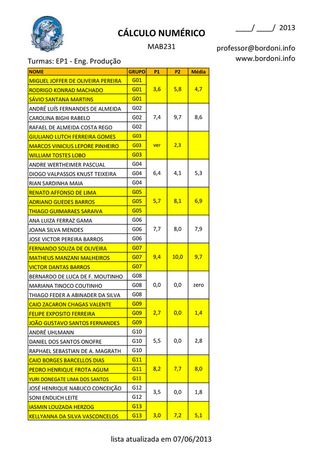 [email protected] www.bordoni.info NOME GRUPO P1 P2 Média MIGUEL JOFFER DE OLIVEIRA PEREIRA G01 RODRIGO KONRAD MACHADO G01 SÁVIO SANTANA MARTINS G01 ANDRÉ LUÍS FERNANDES DE ALMEIDA G02 CAROLINA BIGHI RABELO G02 RAFAEL DE ALMEIDA COSTA REGO G02 GIULIANO LUTCH FERREIRA GOMES G03 MARCOS VINICIUS LEPORE PINHEIRO G03 WILLIAM TOSTES LOBO G03 ANDRE WERTHEIMER PASCUAL G04 DIOGO VALPASSOS KNUST TEIXEIRA G04 RIAN SARDINHA MAIA G04 RENATO AFFONSO DE LIMA G05 ADRIANO GUEDES BARROS G05 THIAGO GUIMARAES SARAIVA G05 ANA LUIZA FERRAZ GAMA G06 JOANA SILVA MENDES G06 JOSE VICTOR PEREIRA BARROS G06 FERNANDO SOUZA DE OLIVEIRA G07 MATHEUS MANZANI MALHEIROS G07 VICTOR DANTAS BARROS G07 BERNARDO DE LUCA DE F. MOUTINHO G08 MARIANA TINOCO COUTINHO G08 THIAGO FEDER A ABINADER DA SILVA G08 CAIO ZACARON CHAGAS VALENTE G09 FELIPE EXPOSITO FERREIRA G09 JOÃO GUSTAVO SANTOS FERNANDES G09 ANDRÉ UHLMANN G10 DANIEL DOS SANTOS ONOFRE G10 RAPHAEL SEBASTIAN DE A. MAGRATH G10 CAIO BORGES BARCELLOS DIAS G11 PEDRO HENRIQUE FROTA AGUM G11 YURI DONEGATE LIMA DOS SANTOS G11 JOSÉ HENRIQUE NABUCO CONCEIÇÃO G12 SONI ENDLICH LEITE G12 IASMIN LOUZADA HERZOG G13 KELLYANNA DA SILVA VASCONCELOS G13 2,8 8,0 1,8 7,9 9,7 zero 1,4 5,1 4,7 8,6 5,3 6,9 7,7 0,0 7,2 3,5 3,6 7,4 ver 6,4 5,7 7,7 9,4 0,0 2,7 5,5 8,2 0,0 0,0 5,8 9,7 2,3 4,1 8,1 8,0 10,0 0,0 3,0 lista atualizada em 07/06/2013