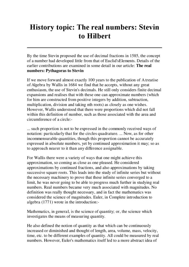 his lectures. Heine's system has become one of the two standard ways of defining the real numbers today. Essentially Heine looks at Cauchy sequences of rational numbers. He defines an equivalence relation on such sequences by defining a1 , a2 , a3 , a4 , ... and b1, b2 , b3 , b4 , ... to be equivalent if the sequence of rational numbers a1 - b1, a2 - b2 , a3 - b3 , a4 - b4 , ... converges to 0. Heine then introduced arithmetic operations on his sequences and an order relation. Particular care is needed to handle division since sequences with a non-zero limit might still have terms equal to 0. Cantor also published his version of the real numbers in 1872 which followed a similar method to that of Heine. His numbers were Cauchy sequences of rational numbers and he used the term "determinate limit". It was clear to Hankel (see the quote above) that the new ideas of number had suddenly totally changed a concept which had been motivated by measurement and quantity. Similarly Cantor realised that if he wants the line to represent the real numbers then he has to introduce an axiom to recover the connection between the way the real numbers are now being defined and the old concept of measurement. He writes about a distance of a point from the origin on the line:- If this distance has a rational relation to the unit of measure, then it is expressed by a rational quantity in the domain of rational numbers; otherwise, if the point is one known through a construction, it is always possible to give a sequence of rationals a1 , a2 , a3 , ..., an , ... which has the properties indicated and relates to the distance in question in such a way that the points on the straight line to which the distances a1 , a2 , a3 , ..., an , ... are assigned approach in infinity the point to be determined with increasing n. ... In order to complete the connection presented in this section of the domains of the quantities defined [his determinate limits] with the geometry of the straight line, one must add an axiom which simple says that every numerical quantity also has a determined point on the straight line whose coordinate is equal to that quantity, indeed, equal in the sense in which this is explained in this section. As we mentioned above, Dedekind had worked out his idea of Dedekind cuts in 1858. When he realised that others like Heine and Cantor were about to publish their versions of a rigorous definition of the real numbers he decided that he too should publish his ideas. This resulted in yet another 1872 publication giving a definition of the real numbers. Dedekind considered all decompositions of the rational numbers into two sets A1 , A2 so that a1 < a2 for all a1 in A1 and a2 in A2. He called (A1, A2) a cut. If the rational a is either the