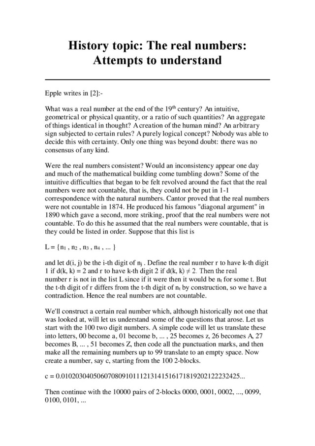 in [2]:- What was a real number at the end of the 19th century? An intuitive, geometrical or physical quantity, or a ratio of such quantities? An aggregate of things identical in thought? A creation of the human mind? An arbitrary sign subjected to certain rules? A purely logical concept? Nobody was able to decide this with certainty. Only one thing was beyond doubt: there was no consensus of any kind. Were the real numbers consistent? Would an inconsistency appear one day and much of the mathematical building come tumbling down? Some of the intuitive difficulties that began to be felt revolved around the fact that the real numbers were not countable, that is, they could not be put in 1-1 correspondence with the natural numbers. Cantor proved that the real numbers were not countable in 1874. He produced his famous "diagonal argument" in 1890 which gave a second, more striking, proof that the real numbers were not countable. To do this he assumed that the real numbers were countable, that is they could be listed in order. Suppose that this list is L = {n1 , n2 , n3 , n4 , ... } and let d(i, j) be the i-th digit of nj . Define the real number r to have k-th digit 1 if d(k, k) = 2 and r to have k-th digit 2 if d(k, k) ≠ 2. Then the real number r is not in the list L since if it were then it would be nt for some t. But the t-th digit of r differs from the t-th digit of nt by construction, so we have a contradiction. Hence the real numbers are not countable. We'll construct a certain real number which, although historically not one that was looked at, will let us understand some of the questions that arose. Let us start with the 100 two digit numbers. A simple code will let us translate these into letters, 00 become a, 01 become b, ... , 25 becomes z, 26 becomes A, 27 becomes B, ... , 51 becomes Z, then code all the punctuation marks, and then make all the remaining numbers up to 99 translate to an empty space. Now create a number, say c, starting from the 100 2-blocks. c = 0.01020304050607080910111213141516171819202122232425... Then continue with the 10000 pairs of 2-blocks 0000, 0001, 0002, ..., 0099, 0100, 0101, ...