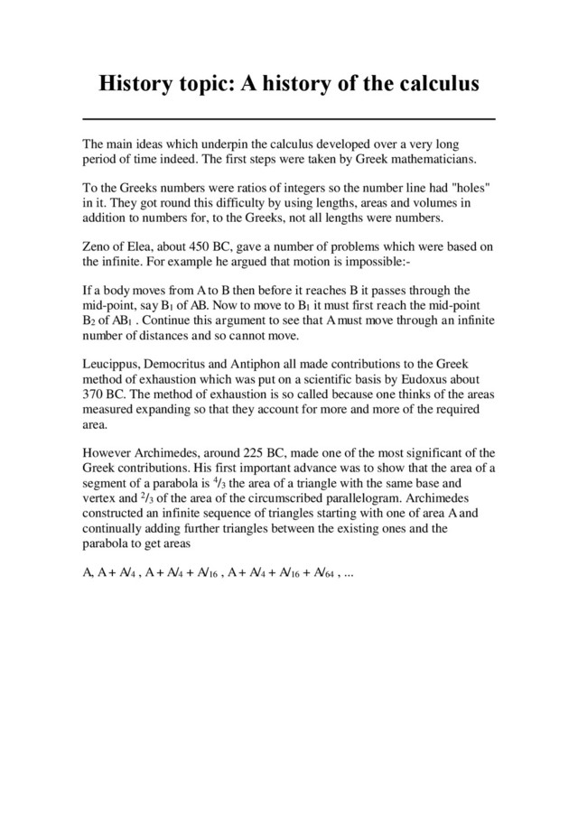 A(1 + 1/4 + 1/4 2 + 1/4 3 + ....) = (4/3)A. This is the first known example of the summation of an infinite series. Archimedes used the method of exhaustion to find an approximation to the area of a circle. This, of course, is an early example of integration which led to approximate values of π. Here is Archimedes' diagram Among other 'integrations' by Archimedes were the volume and surface area of a sphere, the volume and area of a cone, the surface area of an ellipse, the volume of any segment of a paraboloid of revolution and a segment of an hyperboloid of revolution. No further progress was made until the 16th Century when mechanics began to drive mathematicians to examine problems such as centres of gravity. Luca Valerio (1552-1618) published De quadratura parabolae in Rome (1606) which continued the Greek methods of attacking these type of area problems. Kepler, in his work on planetary motion, had to find the area of sectors of an ellipse. His method consisted of thinking of areas as sums of lines, another crude form of integration, but Kepler had little time for Greek rigour and was rather lucky to obtain the correct answer after making two cancelling errors in this work. Three mathematicians, born within three years of each other, were the next to make major contributions. They were Fermat, Roberval and Cavalieri. Cavalieri was led to his 'method of indivisibles' by Kepler's attempts at integration. He was not rigorous in his approach and it is hard to see clearly how he thought about his method. It appears that Cavalieri thought of an area as being made up of components which were lines and then summed his infinite number of 'indivisibles'. He showed, using these methods, that the integral of xn from 0 to a was an+1/(n + 1) by showing the result for a number of values of n and inferring the general result.